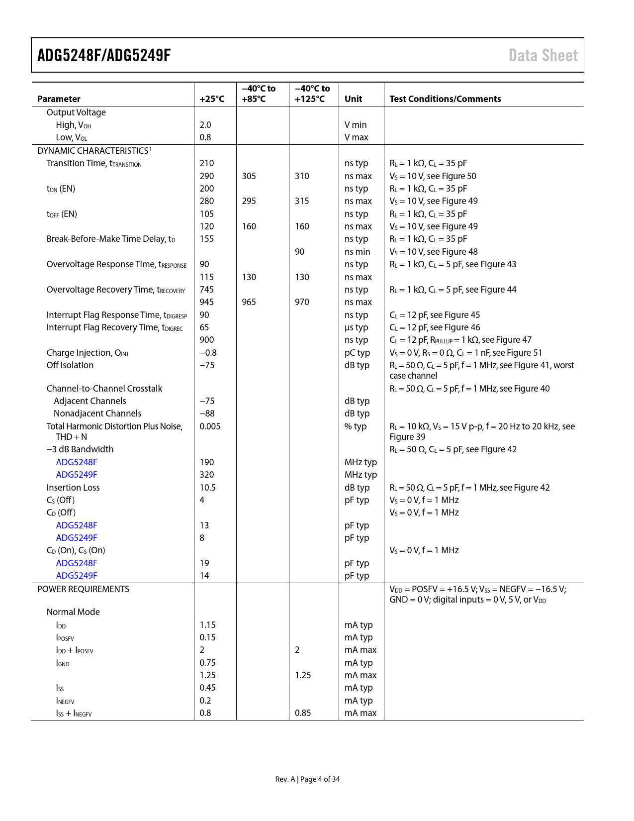 页数 / 页34 / 4 — ADG5248F/ADG5249F. Data Sheet. −40°C to. Parameter. +25°C. +85°C. +125°C. …