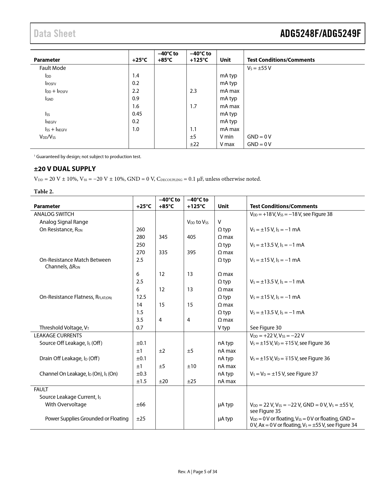 Data Sheet. ADG5248F/ADG5249F. −40°C to. Parameter. +25°C. +85°C. +125°C. Unit. Test Conditions/Comments. ±20 V DUAL SUPPLY. Table 2