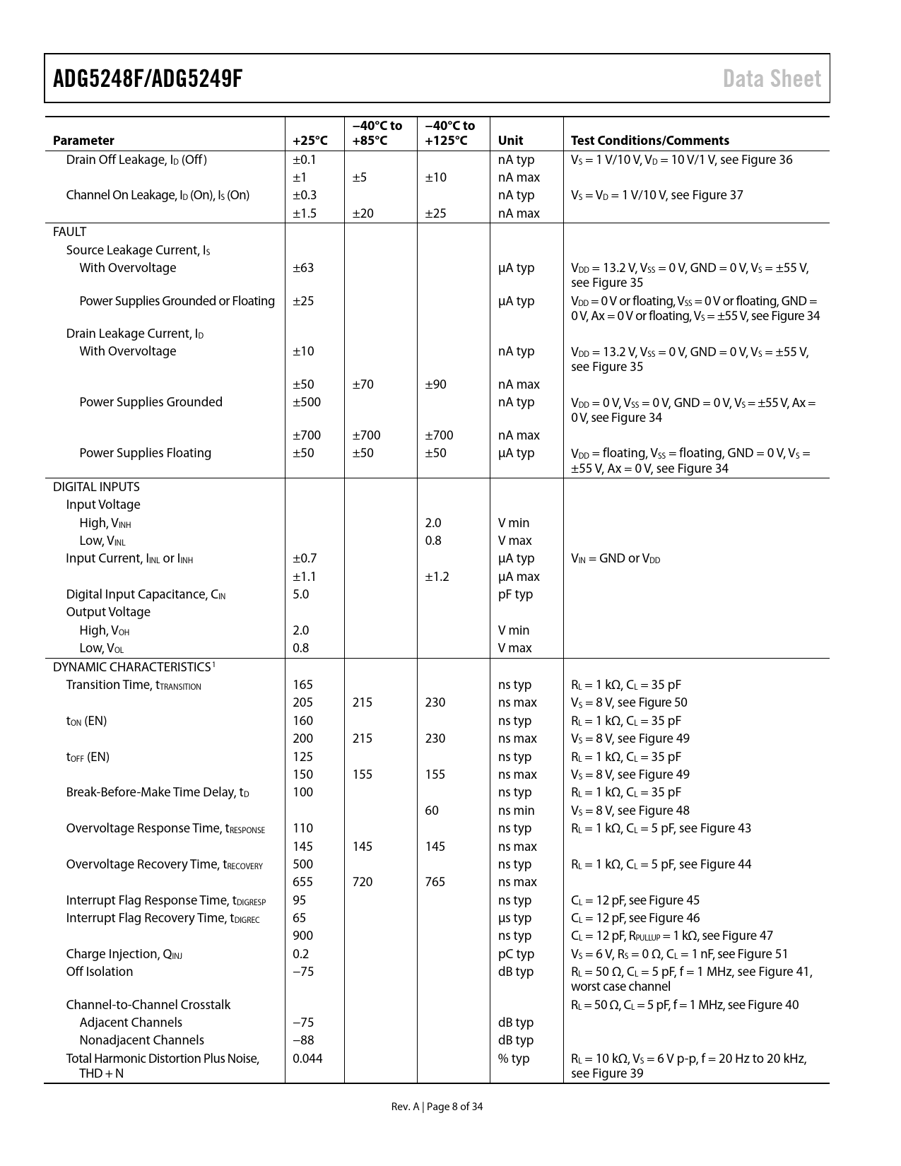页数 / 页34 / 8 — ADG5248F/ADG5249F. Data Sheet. −40°C to. Parameter. +25°C. +85°C. +125°C. …