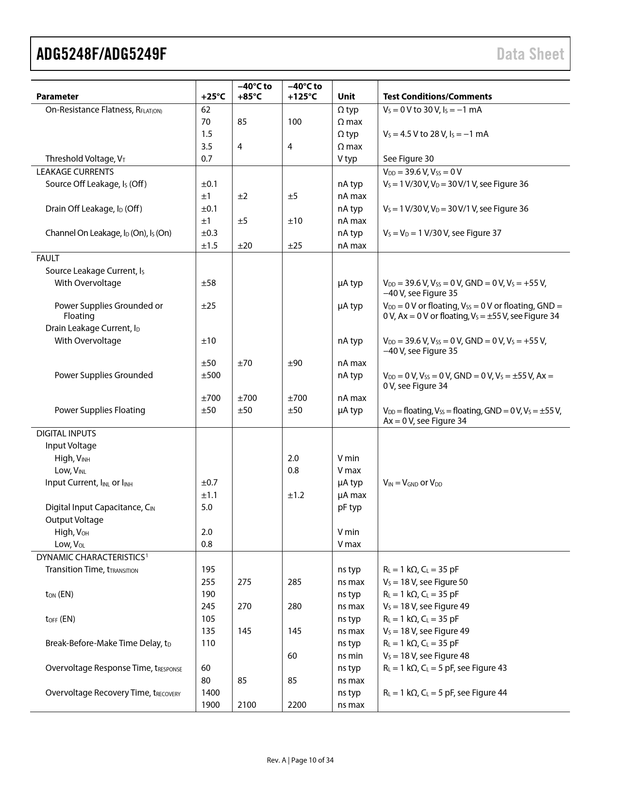 link to page 21 link to page 23 link to page 23 link to page 23 link to page 23 link to page 23 link to page 23 link to page 23 link to page 23 link to page 27 link to page 26 link to page 26 link to page 26 link to page 24 link to page 25 link to page 11 ADG5248F/ADG5249FData Sheet−40°C to−40°C toParameter+25°C +85°C+125°CUnitTest Conditions/Comments On-Resistance Flatness, RFLAT(ON) 62 Ω typ VS = 0 V to 30 V, IS = −1 mA 70 85 100 Ω max 1.5 Ω typ VS = 4.5 V to 28 V, IS = −1 mA 3.5 4 4 Ω max Threshold Voltage, VT 0.7 V typ See Figure 30 LEAKAGE CURRENTS VDD = 39.6 V, VSS = 0 V Source Off Leakage, IS (Off) ±0.1 nA typ VS = 1 V/30 V, VD = 30 V/1 V, see Figure 36 ±1 ±2 ±5 nA max Drain Off Leakage, ID (Off) ±0.1 nA typ VS = 1 V/30 V, VD = 30 V/1 V, see Figure 36 ±1 ±5 ±10 nA max Channel On Leakage, ID (On), IS (On) ±0.3 nA typ VS = VD = 1 V/30 V, see Figure 37 ±1.5 ±20 ±25 nA max FAULT Source Leakage Current, IS With Overvoltage ±58 µA typ VDD = 39.6 V, VSS = 0 V, GND = 0 V, VS = +55 V, −40 V, see Figure 35 Power Supplies Grounded or ±25 µA typ VDD = 0 V or floating, VSS = 0 V or floating, GND = Floating 0 V, Ax = 0 V or floating, VS = ±55 V, see Figure 34 Drain Leakage Current, ID With Overvoltage ±10 nA typ VDD = 39.6 V, VSS = 0 V, GND = 0 V, VS = +55 V, −40 V, see Figure 35 ±50 ±70 ±90 nA max Power Supplies Grounded ±500 nA typ VDD = 0 V, VSS = 0 V, GND = 0 V, VS = ±55 V, Ax = 0 V, see Figure 34 ±700 ±700 ±700 nA max Power Supplies Floating ±50 ±50 ±50 µA typ VDD = floating, VSS = floating, GND = 0 V, VS = ±55 V, Ax = 0 V, see Figure 34 DIGITAL INPUTS Input Voltage High, VINH 2.0 V min Low, VINL 0.8 V max Input Current, IINL or IINH ±0.7 µA typ VIN = VGND or VDD ±1.1 ±1.2 µA max Digital Input Capacitance, CIN 5.0 pF typ Output Voltage High, VOH 2.0 V min Low, VOL 0.8 V max DYNAMIC CHARACTERISTICS1 Transition Time, tTRANSITION 195 ns typ RL = 1 kΩ, CL = 35 pF 255 275 285 ns max VS = 18 V, see Figure 50 tON (EN) 190 ns typ RL = 1 kΩ, CL = 35 pF 245 270 280 ns max VS = 18 V, see Figure 49 tOFF (EN) 105 ns typ RL = 1 kΩ, CL = 35 pF 135 145 145 ns max VS = 18 V, see Figure 49 Break-Before-Make Time Delay, tD 110 ns typ RL = 1 kΩ, CL = 35 pF 60 ns min VS = 18 V, see Figure 48 Overvoltage Response Time, tRESPONSE 60 ns typ RL = 1 kΩ, CL = 5 pF, see Figure 43 80 85 85 ns max Overvoltage Recovery Time, tRECOVERY 1400 ns typ RL = 1 kΩ, CL = 5 pF, see Figure 44 1900 2100 2200 ns max Rev. A | Page 10 of 34 Document Outline FEATURES APPLICATIONS FUNCTIONAL BLOCK DIAGRAMS GENERAL DESCRIPTION PRODUCT HIGHLIGHTS TABLE OF CONTENTS REVISION HISTORY SPECIFICATIONS ±15 V DUAL SUPPLY ±20 V DUAL SUPPLY 12 V SINGLE SUPPLY 36 V SINGLE SUPPLY CONTINUOUS CURRENT PER CHANNEL, Sx, D, OR Dx ABSOLUTE MAXIMUM RATINGS ESD CAUTION PIN CONFIGURATIONS AND FUNCTION DESCRIPTIONS TYPICAL PERFORMANCE CHARACTERISTICS TEST CIRCUITS TERMINOLOGY THEORY OF OPERATION SWITCH ARCHITECTURE ESD Performance Trench Isolation USER DEFINED FAULT PROTECTION Power-On Protection Power-Off Protection Digital Input Protection Overvoltage Interrupt Flag APPLICATIONS INFORMATION POWER SUPPLY RAILS POWER SUPPLY SEQUENCING PROTECTION SIGNAL RANGE POWER SUPPLY RECOMMENDATIONS HIGH VOLTAGE SURGE SUPPRESSION INTELLIGENT FAULT DETECTION LARGE VOLTAGE, HIGH FREQUENCY SIGNALS OUTLINE DIMENSIONS ORDERING GUIDE