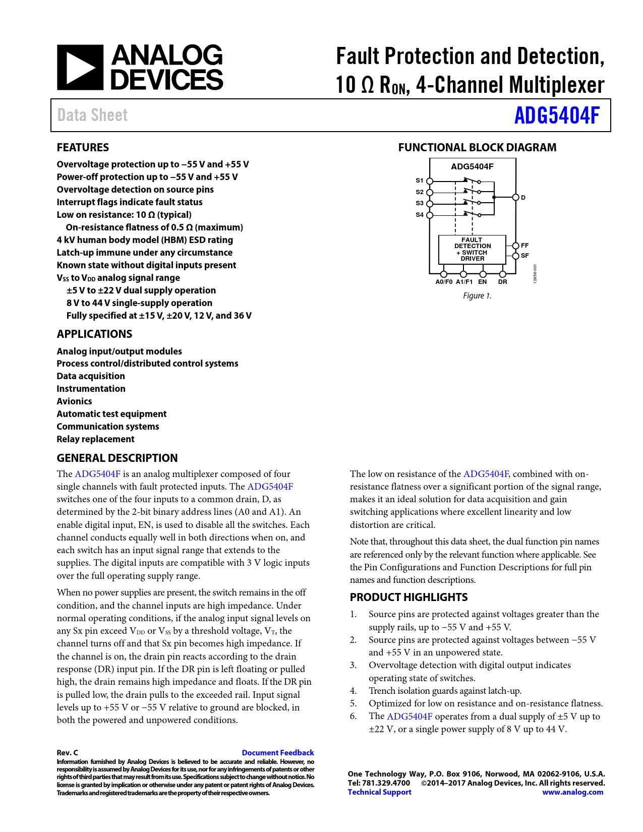Fault Protection and Detection,. 10 Ω R. ON, 4-Channel Multiplexer. Data Sheet. ADG5404F. FEATURES. FUNCTIONAL BLOCK DIAGRAM
