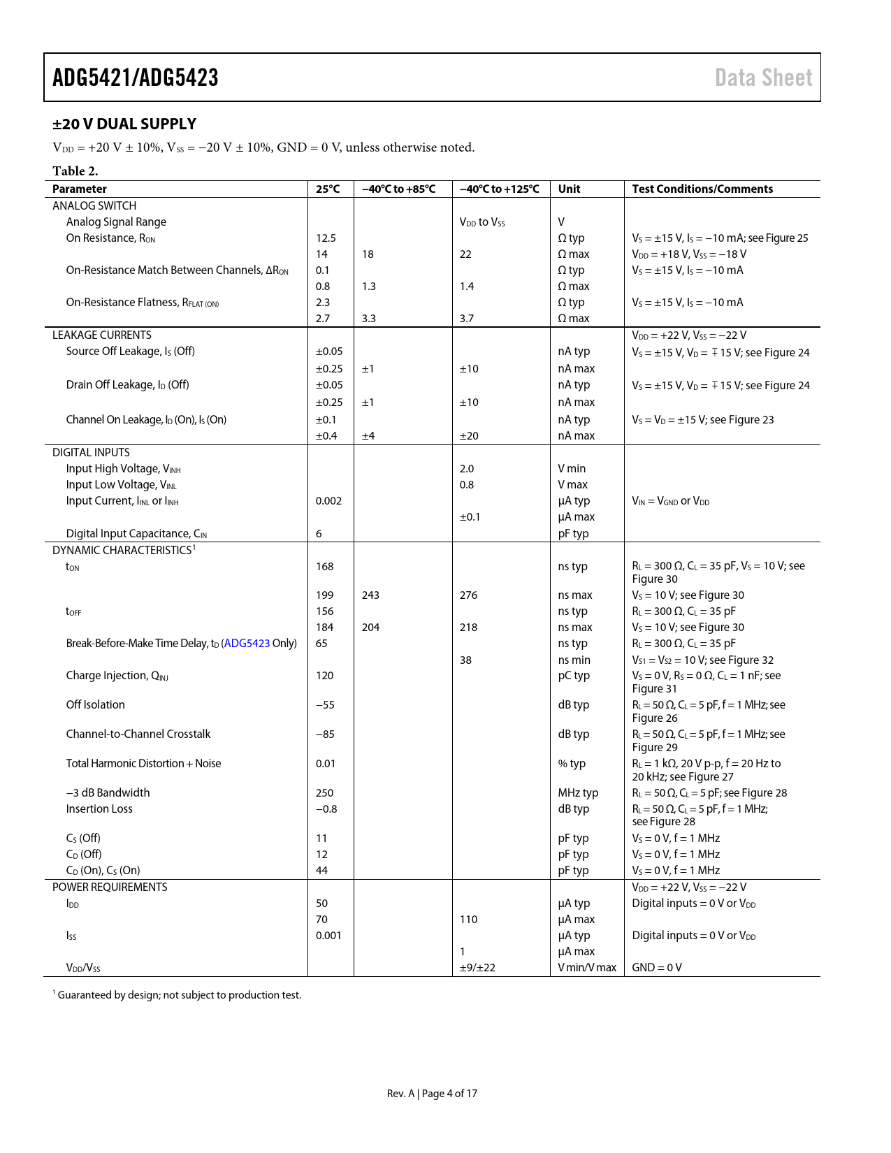 ADG5421/ADG5423. Data Sheet. ±20 V DUAL SUPPLY. Table 2. Parameter. 25°C. −40°C to +85°C. −40°C to +125°C. Unit