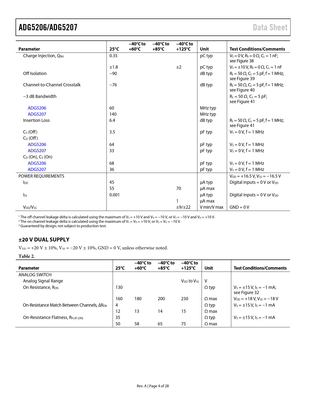 ADG5206/ADG5207. Data Sheet. −40°C to. Parameter. 25°C. +60°C. +85°C. +125°C. Unit. Test Conditions/Comments. ±20 V DUAL SUPPLY. Table 2