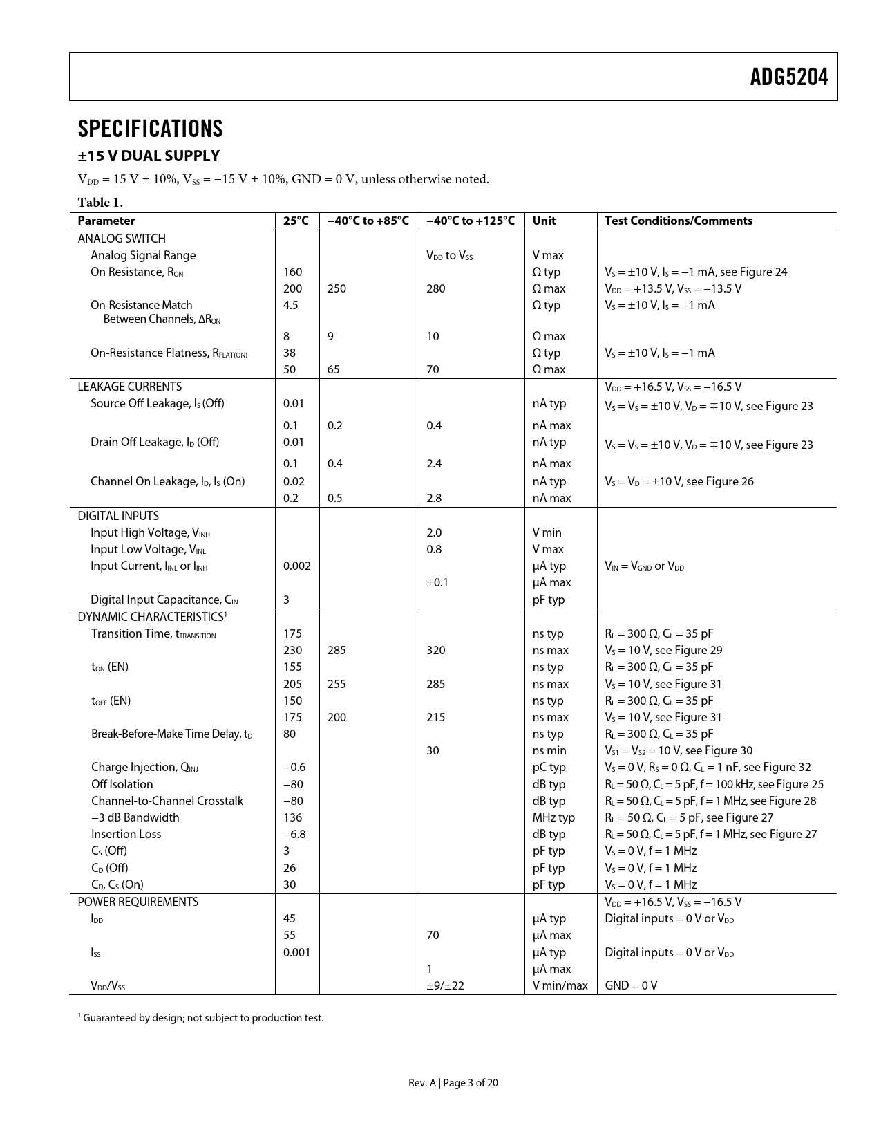 link to page 14 link to page 14 link to page 14 link to page 14 link to page 15 link to page 15 link to page 15 link to page 15 link to page 15 link to page 14 link to page 14 link to page 14 link to page 14 link to page 3 ADG5204SPECIFICATIONS ±15 V DUAL SUPPLY VDD = 15 V ± 10%, VSS = −15 V ± 10%, GND = 0 V, unless otherwise noted. Table 1. Parameter25°C−40°C to +85°C−40°C to +125°C UnitTestConditions/Comments ANALOG SWITCH Analog Signal Range VDD to VSS V max On Resistance, RON 160 Ω typ VS = ±10 V, IS = −1 mA, see Figure 24 200 250 280 Ω max VDD = +13.5 V, VSS = −13.5 V On-Resistance Match 4.5 Ω typ VS = ±10 V, IS = −1 mA Between Channels, ∆RON 8 9 10 Ω max On-Resistance Flatness, RFLAT(ON) 38 Ω typ VS = ±10 V, IS = −1 mA 50 65 70 Ω max LEAKAGE CURRENTS VDD = +16.5 V, VSS = −16.5 V Source Off Leakage, IS (Off) 0.01 nA typ VS = VS = ±10 V, VD = ∓10 V, see Figure 23 0.1 0.2 0.4 nA max Drain Off Leakage, ID (Off) 0.01 nA typ VS = VS = ±10 V, VD = ∓10 V, see Figure 23 0.1 0.4 2.4 nA max Channel On Leakage, ID, IS (On) 0.02 nA typ VS = VD = ±10 V, see Figure 26 0.2 0.5 2.8 nA max DIGITAL INPUTS Input High Voltage, VINH 2.0 V min Input Low Voltage, VINL 0.8 V max Input Current, IINL or IINH 0.002 μA typ VIN = VGND or VDD ±0.1 μA max Digital Input Capacitance, CIN 3 pF typ DYNAMIC CHARACTERISTICS1 Transition Time, tTRANSITION 175 ns typ RL = 300 Ω, CL = 35 pF 230 285 320 ns max VS = 10 V, see Figure 29 tON (EN) 155 ns typ RL = 300 Ω, CL = 35 pF 205 255 285 ns max VS = 10 V, see Figure 31 tOFF (EN) 150 ns typ RL = 300 Ω, CL = 35 pF 175 200 215 ns max VS = 10 V, see Figure 31 Break-Before-Make Time Delay, tD 80 ns typ RL = 300 Ω, CL = 35 pF 30 ns min VS1 = VS2 = 10 V, see Figure 30 Charge Injection, QINJ −0.6 pC typ VS = 0 V, RS = 0 Ω, CL = 1 nF, see Figure 32 Off Isolation −80 dB typ RL = 50 Ω, CL = 5 pF, f = 100 kHz, see Figure 25 Channel-to-Channel Crosstalk −80 dB typ RL = 50 Ω, CL = 5 pF, f = 1 MHz, see Figure 28 −3 dB Bandwidth 136 MHz typ RL = 50 Ω, CL = 5 pF, see Figure 27 Insertion Loss −6.8 dB typ RL = 50 Ω, CL = 5 pF, f = 1 MHz, see Figure 27 CS (Off) 3 pF typ VS = 0 V, f = 1 MHz CD (Off) 26 pF typ VS = 0 V, f = 1 MHz CD, CS (On) 30 pF typ VS = 0 V, f = 1 MHz POWER REQUIREMENTS VDD = +16.5 V, VSS = −16.5 V IDD 45 μA typ Digital inputs = 0 V or VDD 55 70 μA max ISS 0.001 μA typ Digital inputs = 0 V or VDD 1 μA max VDD/VSS ±9/±22 V min/max GND = 0 V 1 Guaranteed by design; not subject to production test. Rev. A | Page 3 of 20 Document Outline FEATURES APPLICATIONS FUNCTIONAL BLOCK DIAGRAM GENERAL DESCRIPTION PRODUCT HIGHLIGHTS TABLE OF CONTENTS REVISION HISTORY SPECIFICATIONS ±15 V DUAL SUPPLY ±20 V DUAL SUPPLY 12 V SINGLE SUPPLY 36 V SINGLE SUPPLY CONTINUOUS CURRENT PER CHANNEL, Sx OR D ABSOLUTE MAXIMUM RATINGS ESD CAUTION PIN CONFIGURATIONS AND FUNCTION DESCRIPTIONS TRUTH TABLE TYPICAL PERFORMANCE CHARACTERISTICS TEST CIRCUITS TERMINOLOGY TRENCH ISOLATION APPLICATIONS INFORMATION OUTLINE DIMENSIONS ORDERING GUIDE
