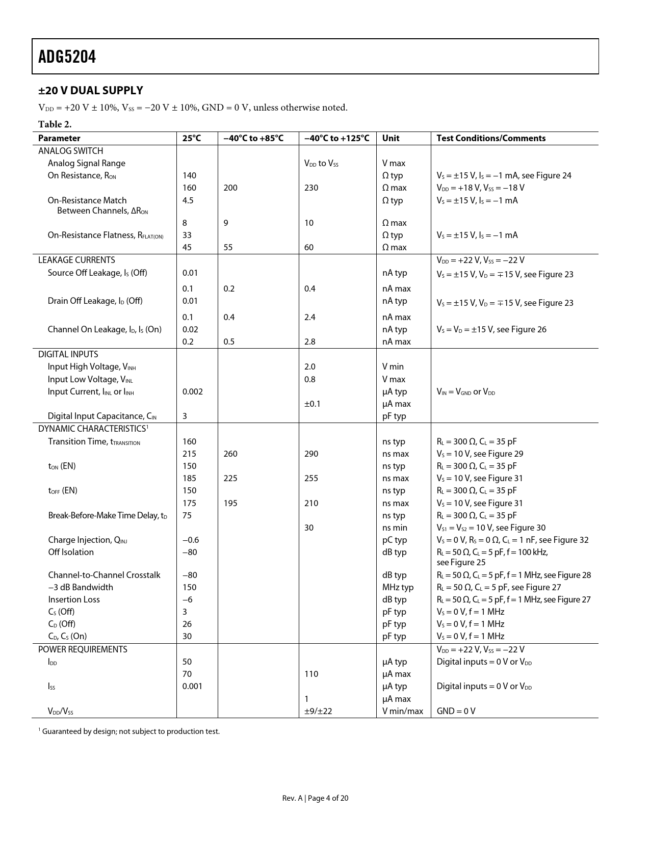页数 / 页20 / 4 — ADG5204. ±20 V DUAL SUPPLY. Table 2. Parameter. 25°C. −40°C to +85°C. …