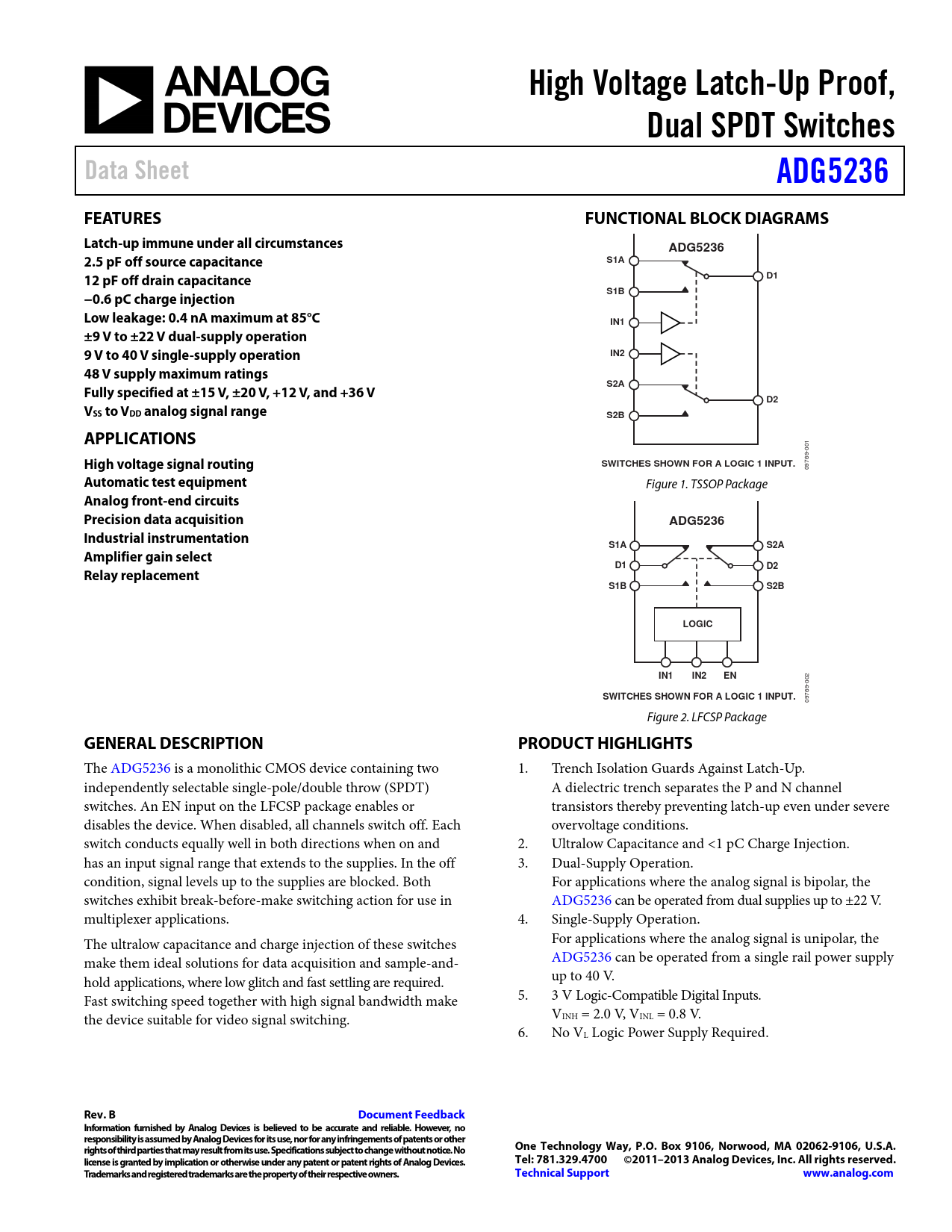 High Voltage Latch-Up Proof,. Dual SPDT Switches. Data Sheet. ADG5236. FEATURES. FUNCTIONAL BLOCK DIAGRAMS