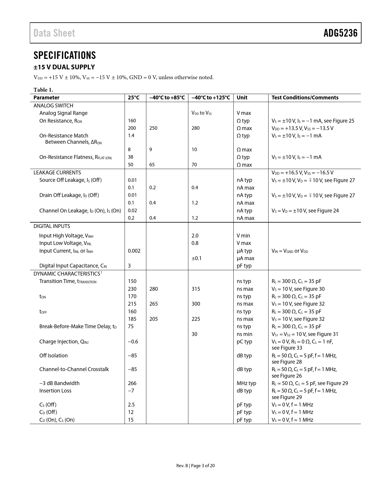 页数 / 页20 / 3 — Data Sheet. ADG5236. SPECIFICATIONS ±15 V DUAL SUPPLY. Table 1. …