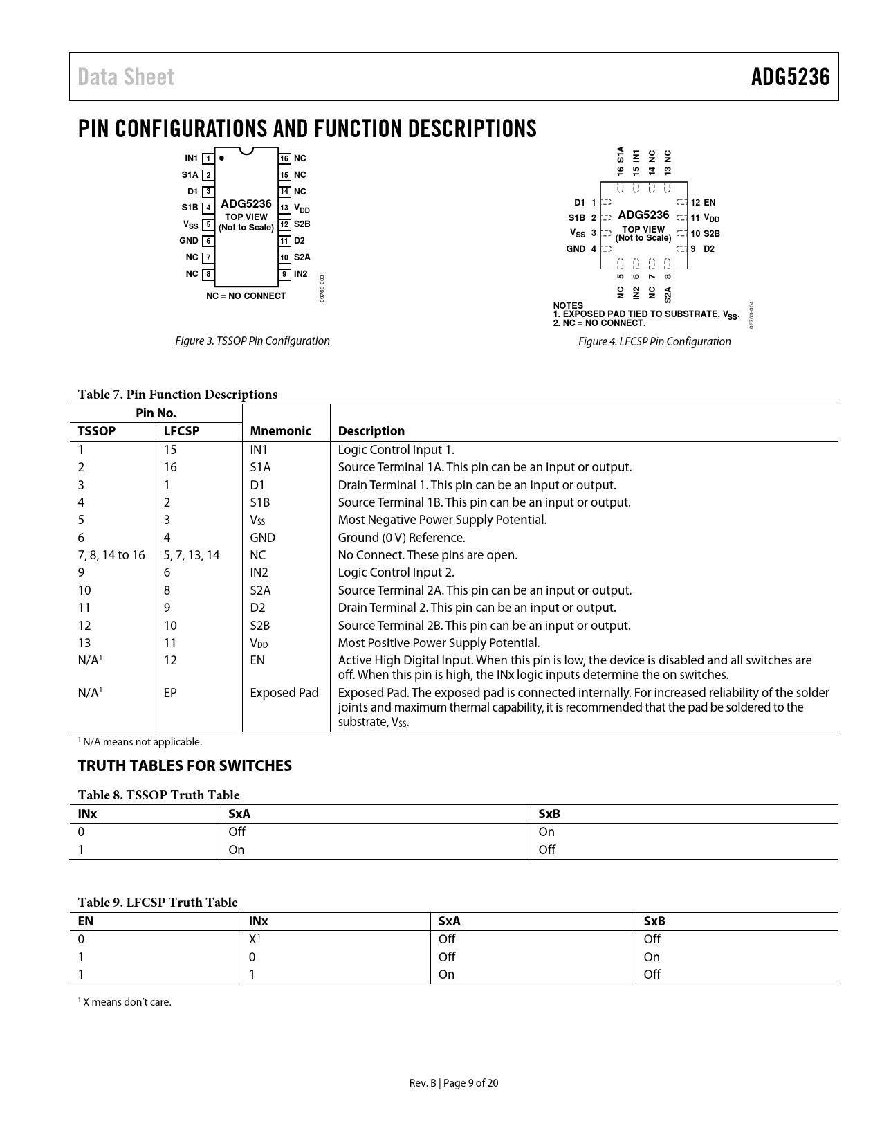 1 15 IN1 Logic Control Input 1. 2 16 S1A Source Terminal 1A. This pin can be an input or output. 3 1 D1 Drain Terminal 1. This pin can be an input or output. 4 2 S1B Source Terminal 1B. This pin can be an input or output. 5 3 VSS Most Negative Power Supply Potential. 6 4 GND Ground (0 V) Reference. 7, 8, 14 to 16 5, 7, 13, 14 NC No Connect. These pins are open. 9 6 IN2 Logic Control Input 2. 10 8 S2A Source Terminal 2A. This pin can be an input or output. 11 9 D2 Drain Terminal 2. This pin can be an input or output. 12 10 S2B Source Terminal 2B. This pin can be an input or output. 13 11 VDD Most Positive Power Supply Potential. N/A1 12 EN Active High Digital Input. When this pin is low, the device is disabled and all switches are off. When this pin is high, the INx logic inputs determine the on switches. N/A1 EP Exposed Pad Exposed Pad. The exposed pad is connected internally. For increased reliability of the solder joints and maximum thermal capability, it is recommended that the pad be soldered to the substrate, VSS. 1 N/A means not applicable.