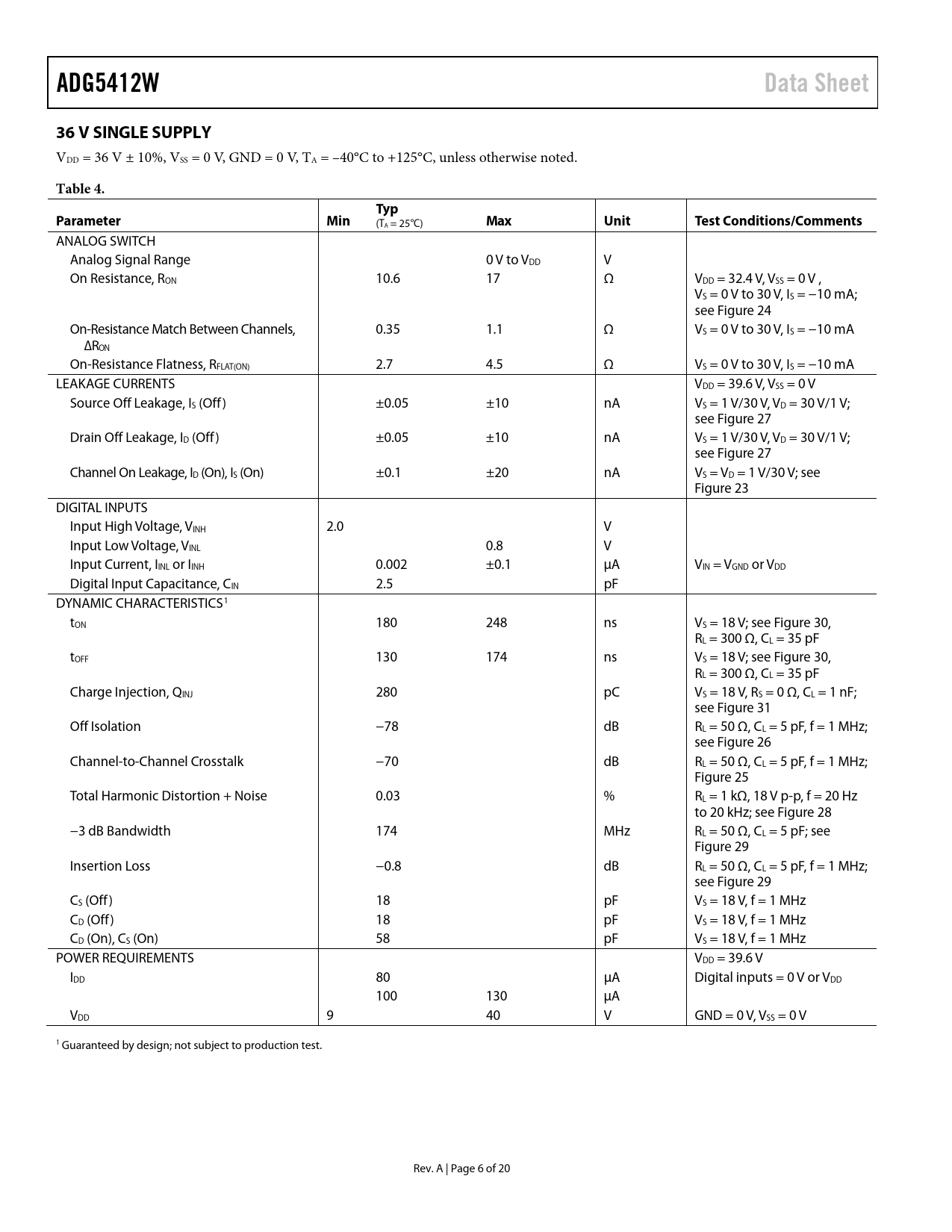 link to page 14 link to page 14 link to page 14 link to page 14 link to page 15 link to page 15 link to page 15 link to page 14 link to page 14 link to page 14 link to page 14 link to page 14 link to page 6 ADG5412WData Sheet36 V SINGLE SUPPLY VDD = 36 V ± 10%, VSS = 0 V, GND = 0 V, TA = –40°C to +125°C, unless otherwise noted. Table 4.TypParameterMin (TA = 25°C) MaxUnitTest Conditions/Comments ANALOG SWITCH Analog Signal Range 0 V to VDD V On Resistance, RON 10.6 17 Ω VDD = 32.4 V, VSS = 0 V , VS = 0 V to 30 V, IS = −10 mA; see Figure 24 On-Resistance Match Between Channels, 0.35 1.1 Ω VS = 0 V to 30 V, IS = −10 mA ∆RON On-Resistance Flatness, RFLAT(ON) 2.7 4.5 Ω VS = 0 V to 30 V, IS = −10 mA LEAKAGE CURRENTS VDD = 39.6 V, VSS = 0 V Source Off Leakage, IS (Off) ±0.05 ±10 nA VS = 1 V/30 V, VD = 30 V/1 V; see Figure 27 Drain Off Leakage, ID (Off) ±0.05 ±10 nA VS = 1 V/30 V, VD = 30 V/1 V; see Figure 27 Channel On Leakage, ID (On), IS (On) ±0.1 ±20 nA VS = VD = 1 V/30 V; see Figure 23 DIGITAL INPUTS Input High Voltage, VINH 2.0 V Input Low Voltage, VINL 0.8 V Input Current, IINL or IINH 0.002 ±0.1 µA VIN = VGND or VDD Digital Input Capacitance, CIN 2.5 pF DYNAMIC CHARACTERISTICS1 tON 180 248 ns VS = 18 V; see Figure 30, RL = 300 Ω, CL = 35 pF tOFF 130 174 ns VS = 18 V; see Figure 30, RL = 300 Ω, CL = 35 pF Charge Injection, QINJ 280 pC VS = 18 V, RS = 0 Ω, CL = 1 nF; see Figure 31 Off Isolation −78 dB RL = 50 Ω, CL = 5 pF, f = 1 MHz; see Figure 26 Channel-to-Channel Crosstalk −70 dB RL = 50 Ω, CL = 5 pF, f = 1 MHz; Figure 25 Total Harmonic Distortion + Noise 0.03 % RL = 1 kΩ, 18 V p-p, f = 20 Hz to 20 kHz; see Figure 28 −3 dB Bandwidth 174 MHz RL = 50 Ω, CL = 5 pF; see Figure 29 Insertion Loss −0.8 dB RL = 50 Ω, CL = 5 pF, f = 1 MHz; see Figure 29 CS (Off) 18 pF VS = 18 V, f = 1 MHz CD (Off) 18 pF VS = 18 V, f = 1 MHz CD (On), CS (On) 58 pF VS = 18 V, f = 1 MHz POWER REQUIREMENTS VDD = 39.6 V IDD 80 µA Digital inputs = 0 V or VDD 100 130 µA VDD 9 40 V GND = 0 V, VSS = 0 V 1 Guaranteed by design; not subject to production test. Rev. A | Page 6 of 20 Document Outline Features Applications Functional Block Diagram General Description Product Highlights Table of Contents Revision History Specifications ±15 V Dual Supply ±20 V Dual Supply 12 V Single Supply 36 V Single Supply Continuous Current per Channel, Sx or Dx Absolute Maximum Ratings ESD Caution Pin Configurations and Function Descriptions Typical Performance Characteristics Test Circuits Terminology Applications Information Trench Isolation Outline Dimensions Ordering Guide Automotive Products