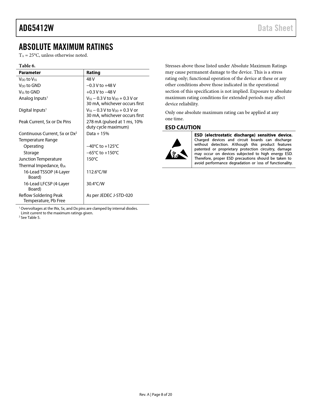 页数 / 页20 / 8 — ADG5412W. Data Sheet. ABSOLUTE MAXIMUM RATINGS. Table 6. Parameter. …