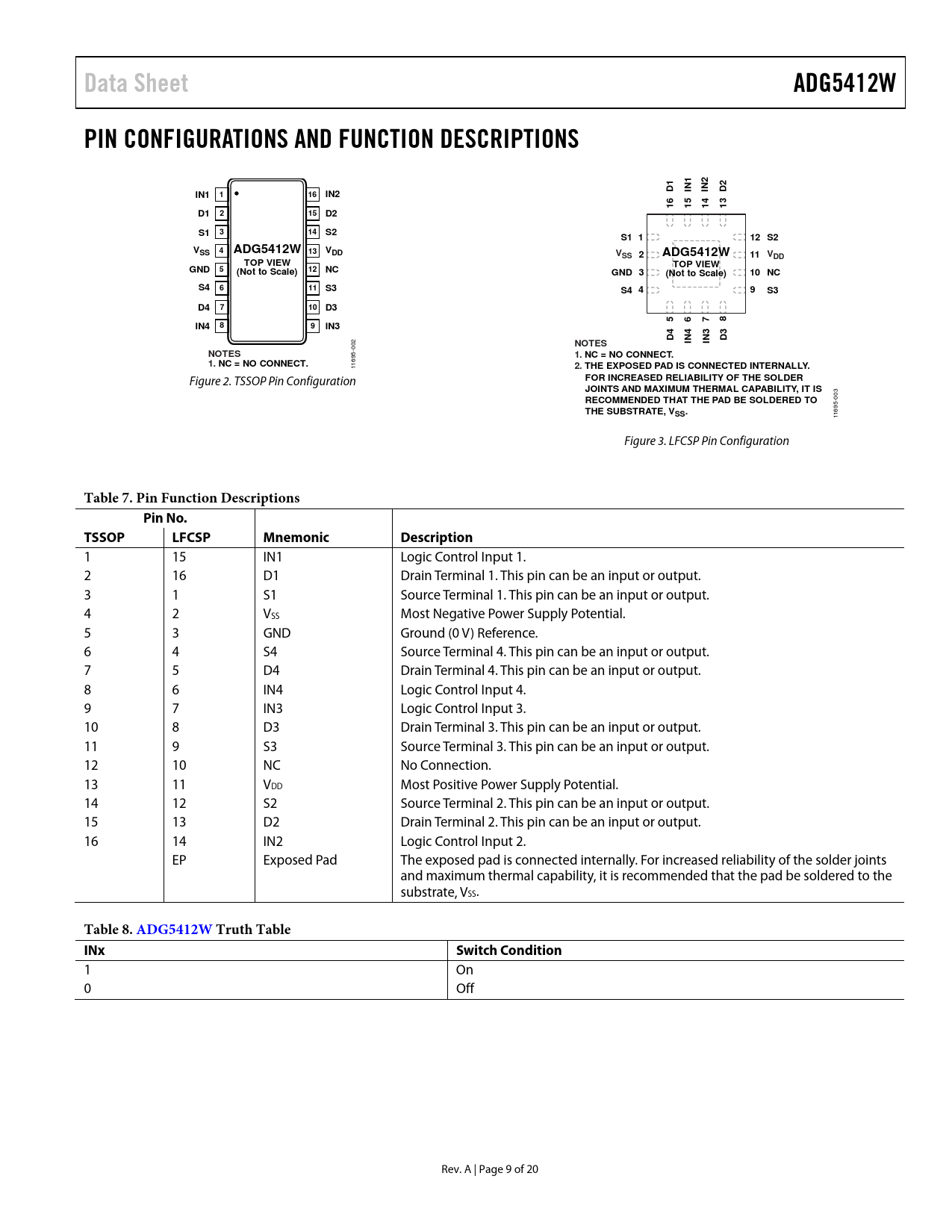 页数 / 页20 / 9 — Data Sheet. ADG5412W. PIN CONFIGURATIONS AND FUNCTION DESCRIPTIONS. IN1. …