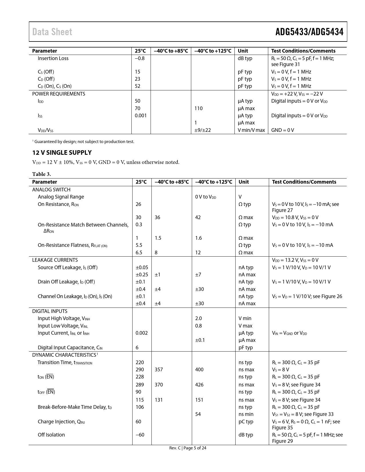 Data Sheet. ADG5433/ADG5434. Parameter. 25°C −40°C to +85°C −40°C to +125°C Unit. Test Conditions/Comments. 12 V SINGLE SUPPLY
