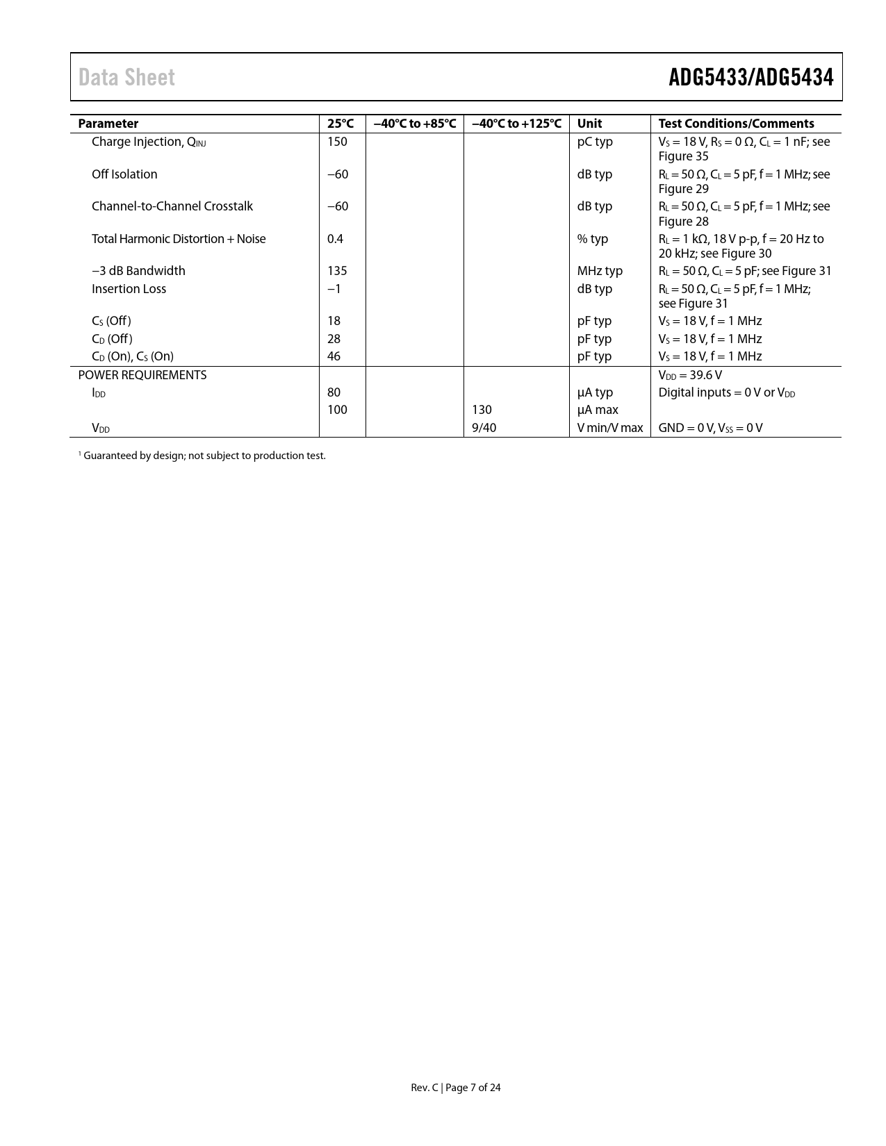 link to page 17 link to page 16 link to page 16 link to page 16 link to page 16 link to page 16 Data SheetADG5433/ADG5434Parameter25°C−40°C to +85°C −40°C to +125°C UnitTest Conditions/Comments Charge Injection, QINJ 150 pC typ VS = 18 V, RS = 0 Ω, CL = 1 nF; see Figure 35 Off Isolation −60 dB typ RL = 50 Ω, CL = 5 pF, f = 1 MHz; see Figure 29 Channel-to-Channel Crosstalk −60 dB typ RL = 50 Ω, CL = 5 pF, f = 1 MHz; see Figure 28 Total Harmonic Distortion + Noise 0.4 % typ RL = 1 kΩ, 18 V p-p, f = 20 Hz to 20 kHz; see Figure 30 −3 dB Bandwidth 135 MHz typ RL = 50 Ω, CL = 5 pF; see Figure 31 Insertion Loss −1 dB typ RL = 50 Ω, CL = 5 pF, f = 1 MHz; see Figure 31 CS (Off) 18 pF typ VS = 18 V, f = 1 MHz CD (Off) 28 pF typ VS = 18 V, f = 1 MHz CD (On), CS (On) 46 pF typ VS = 18 V, f = 1 MHz POWER REQUIREMENTS VDD = 39.6 V IDD 80 µA typ Digital inputs = 0 V or VDD 100 130 µA max VDD 9/40 V min/V max GND = 0 V, VSS = 0 V 1 Guaranteed by design; not subject to production test. Rev. C | Page 7 of 24 Document Outline Features Applications Functional Block Diagrams General Description Product Highlights Revision History Specifications ±15 V Dual Supply ±20 V Dual Supply 12 V Single Supply 36 V Single Supply Continuous Current per Channel, Sx or Dx Absolute Maximum Ratings ESD Caution Pin Configurations and Function Descriptions Typical Performance Characteristics Test Circuits Terminology Trench Isolation Applications Information Outline Dimensions Ordering Guide