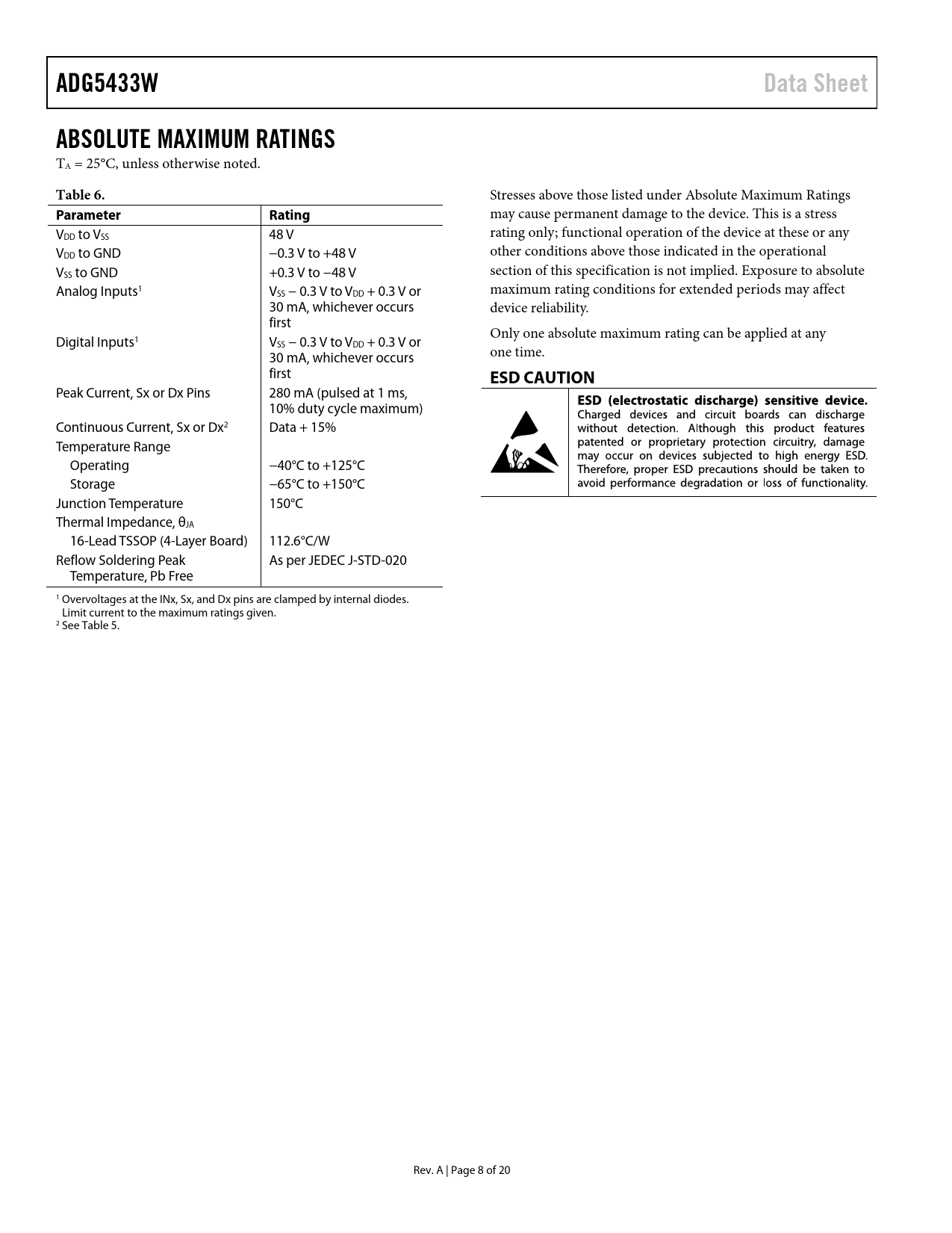 页数 / 页20 / 8 — ADG5433W. Data Sheet. ABSOLUTE MAXIMUM RATINGS. Table 6. Parameter. …