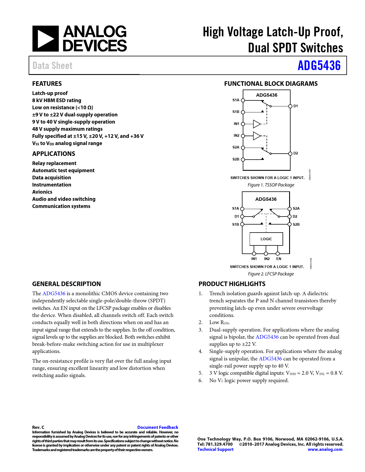 High Voltage Latch-Up Proof,. Dual SPDT Switches. Data Sheet. ADG5436. FEATURES. FUNCTIONAL BLOCK DIAGRAMS. Latch-up proof