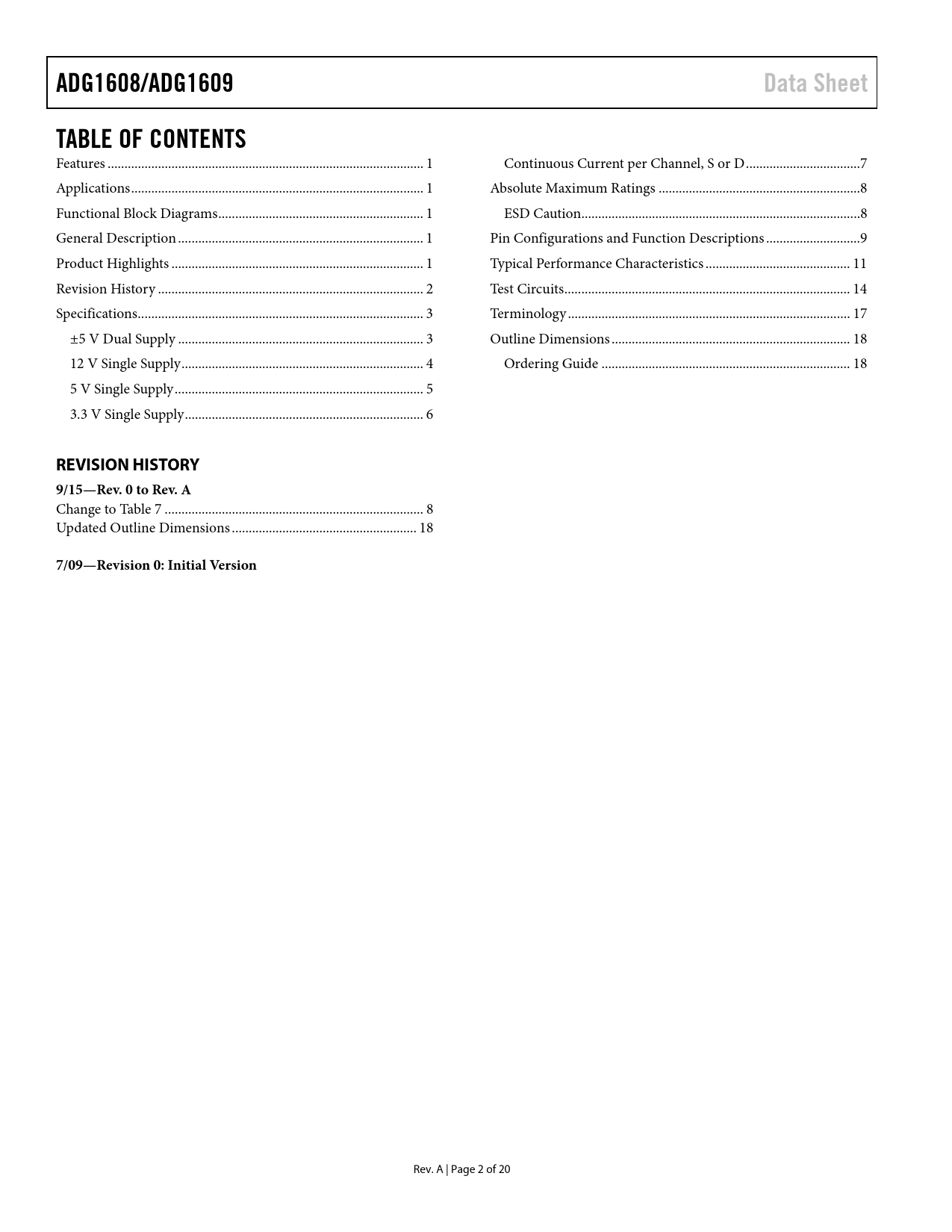 页数 / 页20 / 2 — ADG1608/ADG1609. Data Sheet. TABLE OF CONTENTS. REVISION HISTORY …