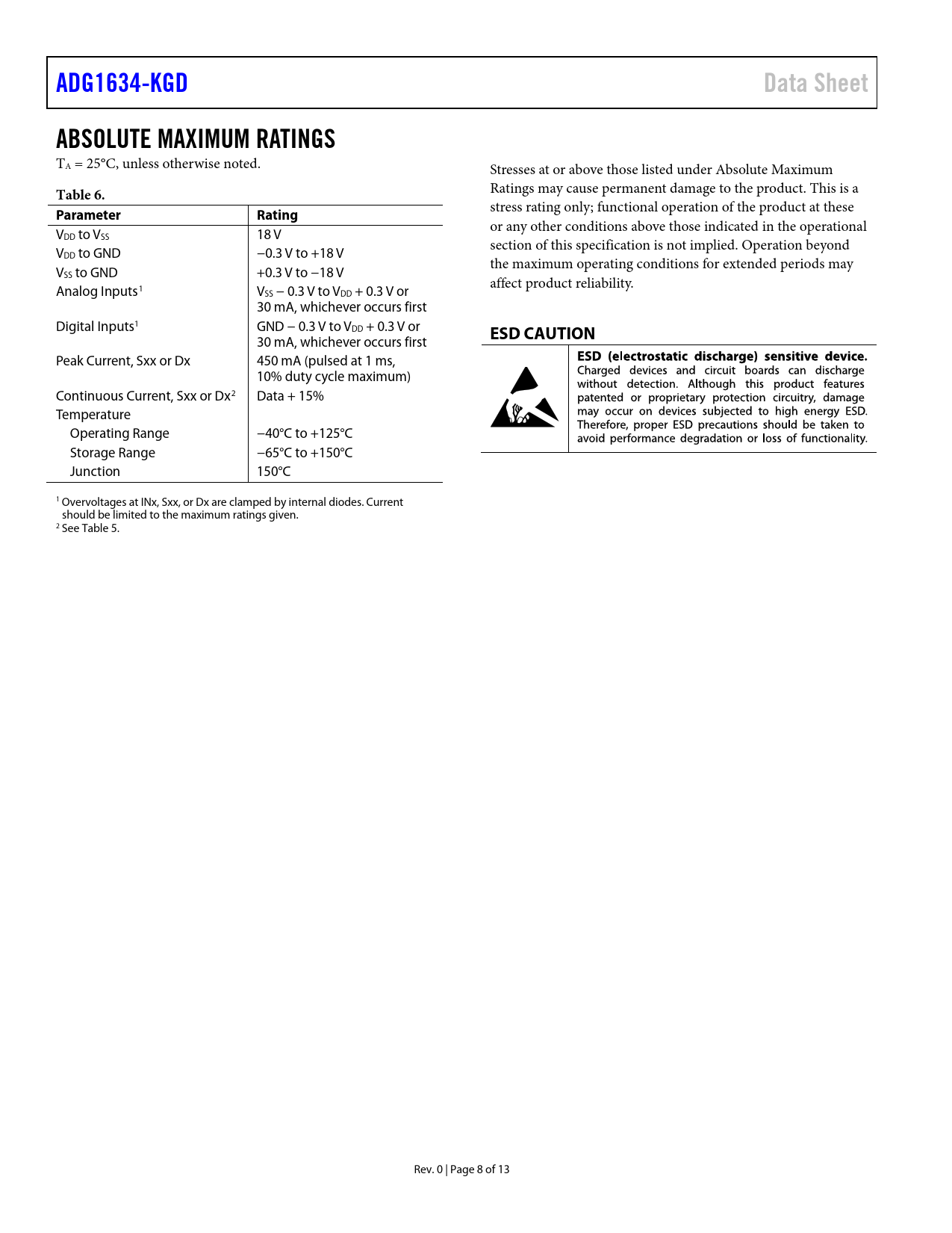 页数 / 页13 / 8 — ADG1634-KGD. Data Sheet. ABSOLUTE MAXIMUM RATINGS. Table 6. Parameter. …