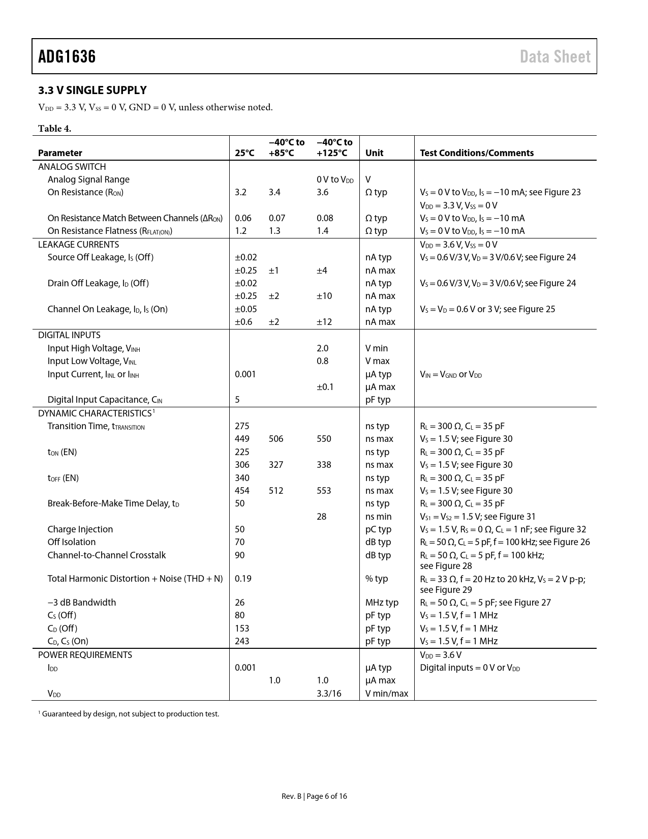 link to page 13 link to page 13 link to page 13 link to page 13 link to page 14 link to page 14 link to page 14 link to page 14 link to page 14 link to page 13 link to page 13 link to page 14 link to page 13 ADG1636Data Sheet3.3 V SINGLE SUPPLY VDD = 3.3 V, VSS = 0 V, GND = 0 V, unless otherwise noted. Table 4.−40°C to −40°C toParameter25°C +85°C+125°CUnitTest Conditions/Comments ANALOG SWITCH Analog Signal Range 0 V to VDD V On Resistance (RON) 3.2 3.4 3.6 Ω typ VS = 0 V to VDD, IS = −10 mA; see Figure 23 VDD = 3.3 V, VSS = 0 V On Resistance Match Between Channels (∆RON) 0.06 0.07 0.08 Ω typ VS = 0 V to VDD, IS = −10 mA On Resistance Flatness (RFLAT(ON)) 1.2 1.3 1.4 Ω typ VS = 0 V to VDD, IS = −10 mA LEAKAGE CURRENTS VDD = 3.6 V, VSS = 0 V Source Off Leakage, IS (Off) ±0.02 nA typ VS = 0.6 V/3 V, VD = 3 V/0.6 V; see Figure 24 ±0.25 ±1 ±4 nA max Drain Off Leakage, ID (Off) ±0.02 nA typ VS = 0.6 V/3 V, VD = 3 V/0.6 V; see Figure 24 ±0.25 ±2 ±10 nA max Channel On Leakage, ID, IS (On) ±0.05 nA typ VS = VD = 0.6 V or 3 V; see Figure 25 ±0.6 ±2 ±12 nA max DIGITAL INPUTS Input High Voltage, VINH 2.0 V min Input Low Voltage, VINL 0.8 V max Input Current, IINL or IINH 0.001 µA typ VIN = VGND or VDD ±0.1 µA max Digital Input Capacitance, CIN 5 pF typ DYNAMIC CHARACTERISTICS1 Transition Time, tTRANSITION 275 ns typ RL = 300 Ω, CL = 35 pF 449 506 550 ns max VS = 1.5 V; see Figure 30 tON (EN) 225 ns typ RL = 300 Ω, CL = 35 pF 306 327 338 ns max VS = 1.5 V; see Figure 30 tOFF (EN) 340 ns typ RL = 300 Ω, CL = 35 pF 454 512 553 ns max VS = 1.5 V; see Figure 30 Break-Before-Make Time Delay, tD 50 ns typ RL = 300 Ω, CL = 35 pF 28 ns min VS1 = VS2 = 1.5 V; see Figure 31 Charge Injection 50 pC typ VS = 1.5 V, RS = 0 Ω, CL = 1 nF; see Figure 32 Off Isolation 70 dB typ RL = 50 Ω, CL = 5 pF, f = 100 kHz; see Figure 26 Channel-to-Channel Crosstalk 90 dB typ RL = 50 Ω, CL = 5 pF, f = 100 kHz; see Figure 28 Total Harmonic Distortion + Noise (THD + N) 0.19 % typ RL = 33 Ω, f = 20 Hz to 20 kHz, VS = 2 V p-p; see Figure 29 −3 dB Bandwidth 26 MHz typ RL = 50 Ω, CL = 5 pF; see Figure 27 CS (Off) 80 pF typ VS = 1.5 V, f = 1 MHz CD (Off) 153 pF typ VS = 1.5 V, f = 1 MHz CD, CS (On) 243 pF typ VS = 1.5 V, f = 1 MHz POWER REQUIREMENTS VDD = 3.6 V IDD 0.001 µA typ Digital inputs = 0 V or VDD 1.0 1.0 µA max VDD 3.3/16 V min/max 1 Guaranteed by design, not subject to production test. Rev. B | Page 6 of 16 Document Outline FEATURES APPLICATIONS FUNCTIONAL BLOCK DIAGRAMS GENERAL DESCRIPTION PRODUCT HIGHLIGHTS TABLE OF CONTENTS REVISION HISTORY SPECIFICATIONS ±5 V DUAL SUPPLY 12 V SINGLE SUPPLY 5 V SINGLE SUPPLY 3.3 V SINGLE SUPPLY CONTINUOUS CURRENT PER CHANNEL, S OR D ABSOLUTE MAXIMUM RATINGS ESD CAUTION PIN CONFIGURATIONS AND FUNCTION DESCRIPTIONS TYPICAL PERFORMANCE CHARACTERISTICS TEST CIRCUITS TERMINOLOGY OUTLINE DIMENSIONS ORDERING GUIDE