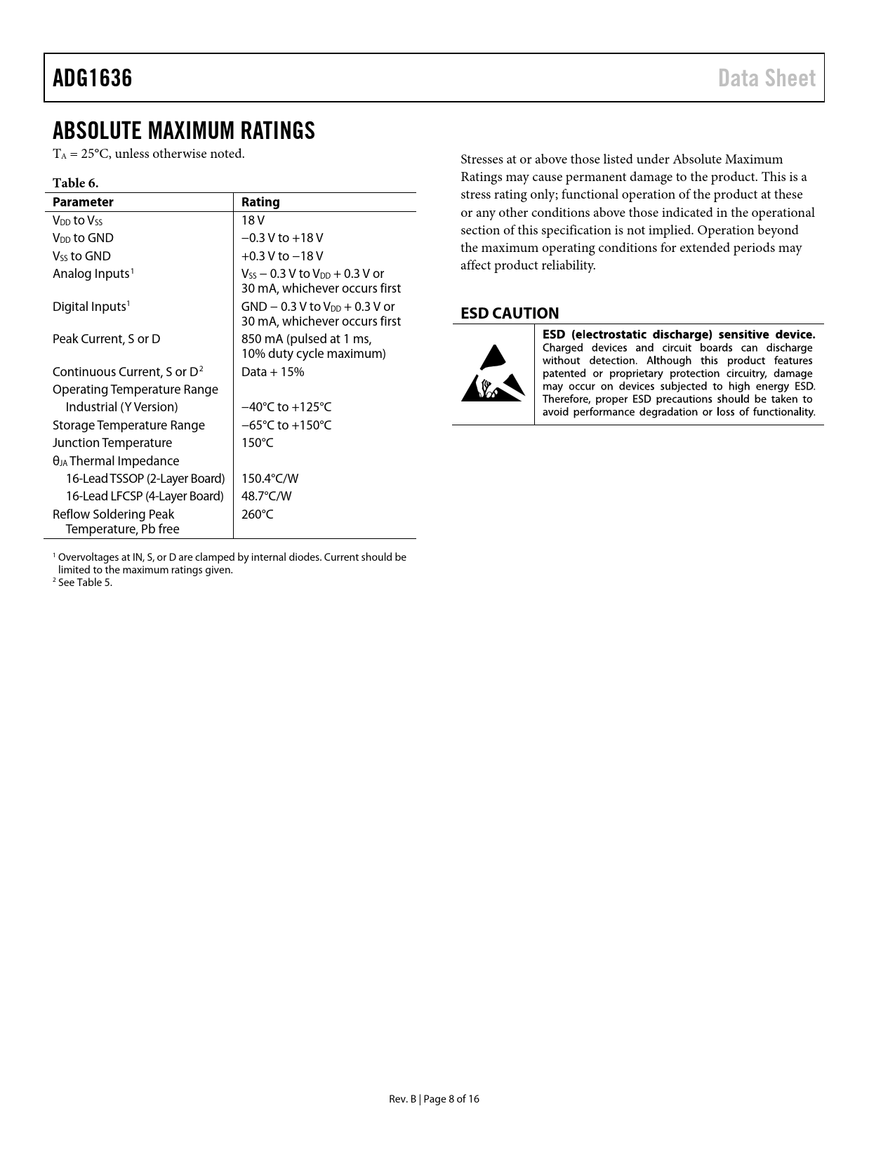 link to page 7 ADG1636Data SheetABSOLUTE MAXIMUM RATINGS TA = 25°C, unless otherwise noted. Stresses at or above those listed under Absolute Maximum Table 6. Ratings may cause permanent damage to the product. This is a ParameterRating stress rating only; functional operation of the product at these or any other conditions above those indicated in the operational VDD to VSS 18 V section of this specification is not implied. Operation beyond VDD to GND −0.3 V to +18 V the maximum operating conditions for extended periods may VSS to GND +0.3 V to −18 V affect product reliability. Analog Inputs1 VSS − 0.3 V to VDD + 0.3 V or 30 mA, whichever occurs first Digital Inputs1 GND − 0.3 V to VDD + 0.3 V or ESD CAUTION 30 mA, whichever occurs first Peak Current, S or D 850 mA (pulsed at 1 ms, 10% duty cycle maximum) Continuous Current, S or D2 Data + 15% Operating Temperature Range Industrial (Y Version) −40°C to +125°C Storage Temperature Range −65°C to +150°C Junction Temperature 150°C θJA Thermal Impedance 16-Lead TSSOP (2-Layer Board) 150.4°C/W 16-Lead LFCSP (4-Layer Board) 48.7°C/W Reflow Soldering Peak 260°C Temperature, Pb free 1 Overvoltages at IN, S, or D are clamped by internal diodes. Current should be limited to the maximum ratings given. 2 See Table 5. Rev. B | Page 8 of 16 Document Outline FEATURES APPLICATIONS FUNCTIONAL BLOCK DIAGRAMS GENERAL DESCRIPTION PRODUCT HIGHLIGHTS TABLE OF CONTENTS REVISION HISTORY SPECIFICATIONS ±5 V DUAL SUPPLY 12 V SINGLE SUPPLY 5 V SINGLE SUPPLY 3.3 V SINGLE SUPPLY CONTINUOUS CURRENT PER CHANNEL, S OR D ABSOLUTE MAXIMUM RATINGS ESD CAUTION PIN CONFIGURATIONS AND FUNCTION DESCRIPTIONS TYPICAL PERFORMANCE CHARACTERISTICS TEST CIRCUITS TERMINOLOGY OUTLINE DIMENSIONS ORDERING GUIDE