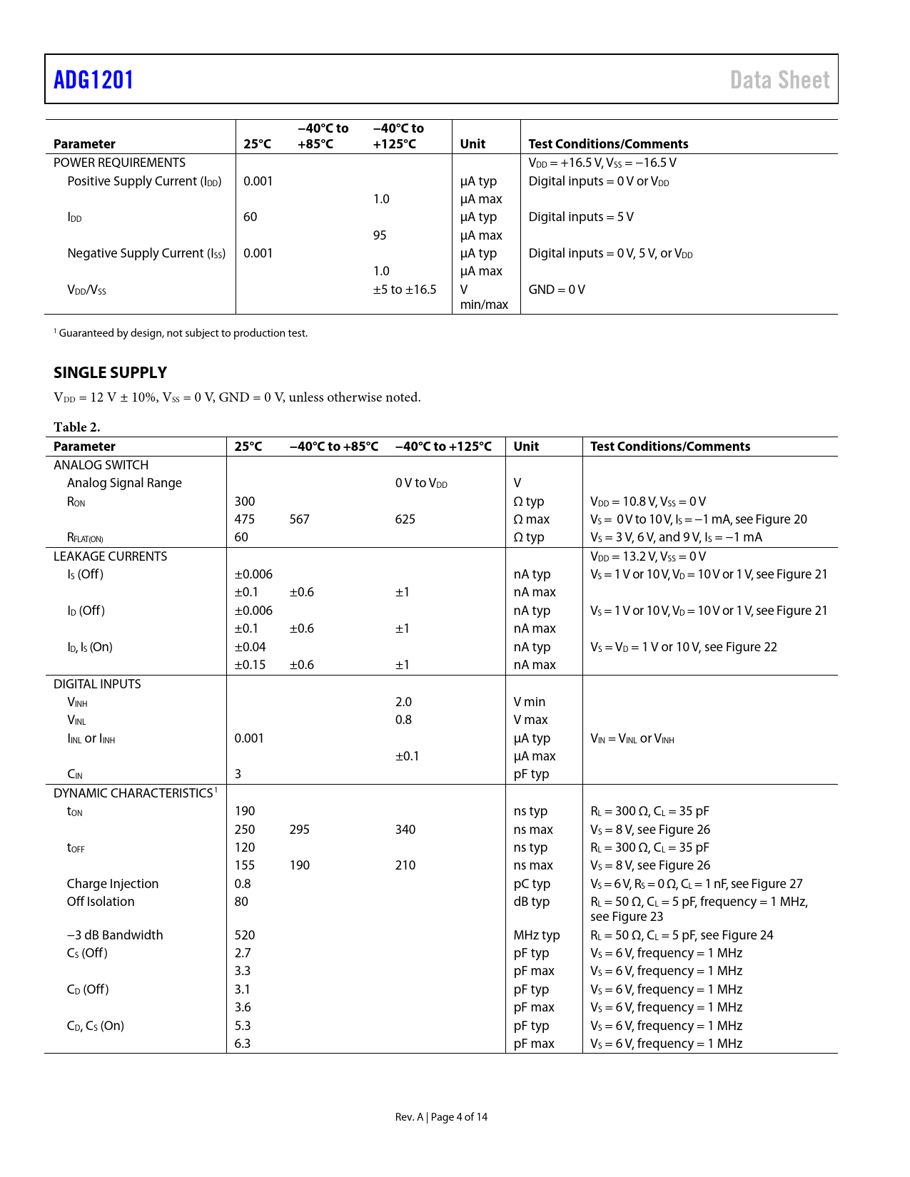 link to page 11 link to page 11 link to page 11 link to page 11 link to page 12 link to page 12 link to page 12 link to page 11 link to page 11 link to page 5 ADG1201Data Sheet−40°C to−40°C toParameter25°C+85°C+125°CUnitTest Conditions/Comments POWER REQUIREMENTS VDD = +16.5 V, VSS = −16.5 V Positive Supply Current (IDD) 0.001 µA typ Digital inputs = 0 V or VDD 1.0 µA max IDD 60 µA typ Digital inputs = 5 V 95 µA max Negative Supply Current (ISS) 0.001 µA typ Digital inputs = 0 V, 5 V, or VDD 1.0 µA max VDD/VSS ±5 to ±16.5 V GND = 0 V min/max 1 Guaranteed by design, not subject to production test. SINGLE SUPPLY VDD = 12 V ± 10%, VSS = 0 V, GND = 0 V, unless otherwise noted. Table 2. Parameter25°C−40°C to +85°C −40°C to +125°CUnitTest Conditions/Comments ANALOG SWITCH Analog Signal Range 0 V to VDD V RON 300 Ω typ VDD = 10.8 V, VSS = 0 V 475 567 625 Ω max VS = 0 V to 10 V, IS = −1 mA, see Figure 20 RFLAT(ON) 60 Ω typ VS = 3 V, 6 V, and 9 V, IS = −1 mA LEAKAGE CURRENTS VDD = 13.2 V, VSS = 0 V IS (Off) ±0.006 nA typ VS = 1 V or 10 V, VD = 10 V or 1 V, see Figure 21 ±0.1 ±0.6 ±1 nA max ID (Off) ±0.006 nA typ VS = 1 V or 10 V, VD = 10 V or 1 V, see Figure 21 ±0.1 ±0.6 ±1 nA max ID, IS (On) ±0.04 nA typ VS = VD = 1 V or 10 V, see Figure 22 ±0.15 ±0.6 ±1 nA max DIGITAL INPUTS VINH 2.0 V min VINL 0.8 V max IINL or IINH 0.001 µA typ VIN = VINL or VINH ±0.1 µA max CIN 3 pF typ DYNAMIC CHARACTERISTICS1 tON 190 ns typ RL = 300 Ω, CL = 35 pF 250 295 340 ns max VS = 8 V, see Figure 26 tOFF 120 ns typ RL = 300 Ω, CL = 35 pF 155 190 210 ns max VS = 8 V, see Figure 26 Charge Injection 0.8 pC typ VS = 6 V, RS = 0 Ω, CL = 1 nF, see Figure 27 Off Isolation 80 dB typ RL = 50 Ω, CL = 5 pF, frequency = 1 MHz, see Figure 23 −3 dB Bandwidth 520 MHz typ RL = 50 Ω, CL = 5 pF, see Figure 24 CS (Off) 2.7 pF typ VS = 6 V, frequency = 1 MHz 3.3 pF max VS = 6 V, frequency = 1 MHz CD (Off) 3.1 pF typ VS = 6 V, frequency = 1 MHz 3.6 pF max VS = 6 V, frequency = 1 MHz CD, CS (On) 5.3 pF typ VS = 6 V, frequency = 1 MHz 6.3 pF max VS = 6 V, frequency = 1 MHz Rev. A | Page 4 of 14 Document Outline Features Applications Functional Block Diagram General Description Product Highlights Revision History Specifications Dual Supply Single Supply Absolute Maximum Ratings Thermal Resistance ESD Caution Pin Configuration and Function Descriptions Typical Performance Characteristics Test Circuits Terminology Outline Dimensions Ordering Guide