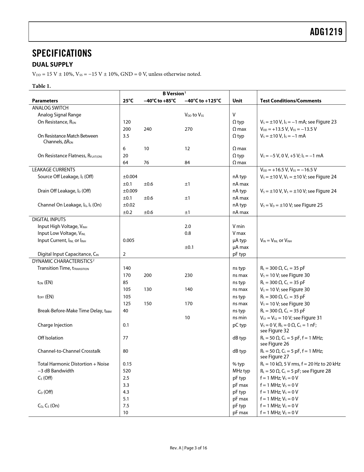 link to page 16 link to page 12 link to page 12 link to page 12 link to page 12 link to page 16 link to page 13 link to page 13 link to page 13 link to page 13 link to page 13 link to page 12 link to page 12 link to page 12 link to page 4 link to page 4 ADG1219SPECIFICATIONS DUAL SUPPLY VDD = 15 V ± 10%, VSS = −15 V ± 10%, GND = 0 V, unless otherwise noted. Table 1. BVersion1Parameters25°C−40°C to +85°C−40°C to +125°CUnitTest Conditions/Comments ANALOG SWITCH Analog Signal Range VDD to VSS V On Resistance, RON 120 Ω typ VS = ±10 V, IS = −1 mA; see Figure 23 200 240 270 Ω max VDD = +13.5 V, VSS = −13.5 V On Resistance Match Between 3.5 Ω typ VS = ±10 V, IS = −1 mA Channels, ∆RON 6 10 12 Ω max On Resistance Flatness, RFLAT(ON) 20 Ω typ VS = −5 V, 0 V, +5 V; IS = −1 mA 64 76 84 Ω max LEAKAGE CURRENTS VDD = +16.5 V, VSS = −16.5 V Source Off Leakage, IS (Off) ±0.004 nA typ VS = ±10 V, VS = ±10 V; see Figure 24 ±0.1 ±0.6 ±1 nA max Drain Off Leakage, ID (Off) ±0.009 nA typ VS = ±10 V, VS = ±10 V; see Figure 24 ±0.1 ±0.6 ±1 nA max Channel On Leakage, ID, IS (On) ±0.02 nA typ VS = VD = ±10 V; see Figure 25 ±0.2 ±0.6 ±1 nA max DIGITAL INPUTS Input High Voltage, VINH 2.0 V min Input Low Voltage, VINL 0.8 V max Input Current, IINL or IINH 0.005 μA typ VIN = VINL or VINH ±0.1 μA max Digital Input Capacitance, CIN 2 pF typ DYNAMIC CHARACTERISTICS2 Transition Time, tTRANSITION 140 ns typ RL = 300 Ω, CL = 35 pF 170 200 230 ns max VS = 10 V; see Figure 30 tON (EN) 85 ns typ RL = 300 Ω, CL = 35 pF 105 130 140 ns max VS = 10 V; see Figure 30 tOFF (EN) 105 ns typ RL = 300 Ω, CL = 35 pF 125 150 170 ns max VS = 10 V; see Figure 30 Break-Before-Make Time Delay, tBBM 40 ns typ RL = 300 Ω, CL = 35 pF 10 ns min VS1 = VS2 = 10 V; see Figure 31 Charge Injection 0.1 pC typ VS = 0 V, RS = 0 Ω, CL = 1 nF; see Figure 32 Off Isolation 77 dB typ RL = 50 Ω, CL = 5 pF, f = 1 MHz; see Figure 26 Channel-to-Channel Crosstalk 80 dB typ RL = 50 Ω, CL = 5 pF, f = 1 MHz; see Figure 27 Total Harmonic Distortion + Noise 0.15 % typ RL = 10 kΩ, 5 V rms, f = 20 Hz to 20 kHz −3 dB Bandwidth 520 MHz typ RL = 50 Ω, CL = 5 pF; see Figure 28 CS (Off) 2.5 pF typ f = 1 MHz; VS = 0 V 3.3 pF max f = 1 MHz; VS = 0 V CD (Off) 4.3 pF typ f = 1 MHz; VS = 0 V 5.1 pF max f = 1 MHz; VS = 0 V CD, CS (On) 7.5 pF typ f = 1 MHz; VS = 0 V 10 pF max f = 1 MHz; VS = 0 V Rev. A | Page 3 of 16 Document Outline FEATURES APPLICATIONS FUNCTIONAL BLOCK DIAGRAM GENERAL DESCRIPTION TABLE OF CONTENTS REVISION HISTORY SPECIFICATIONS DUAL SUPPLY SINGLE SUPPLY ABSOLUTE MAXIMUM RATINGS ESD CAUTION PIN CONFIGURATION AND FUNCTION DESCRIPTIONS TYPICAL PERFORMANCE CHARACTERISTICS TEST CIRCUITS TERMINOLOGY OUTLINE DIMENSIONS ORDERING GUIDE