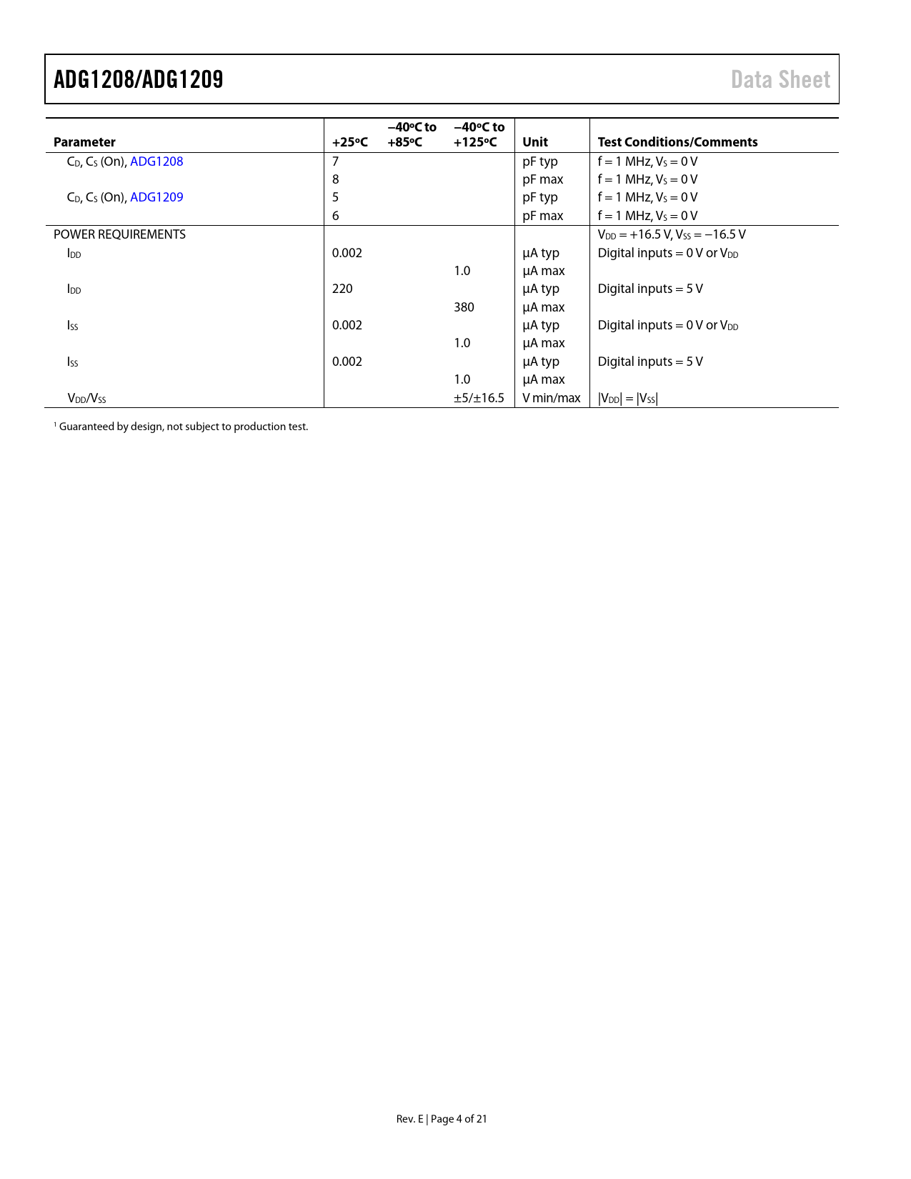 ADG1208/ADG1209Data Sheet−40ºC to −40ºC toParameter+25ºC+85ºC+125ºCUnitTest Conditions/Comments CD, CS (On), ADG1208 7 pF typ f = 1 MHz, VS = 0 V 8 pF max f = 1 MHz, VS = 0 V CD, CS (On), ADG1209 5 pF typ f = 1 MHz, VS = 0 V 6 pF max f = 1 MHz, VS = 0 V POWER REQUIREMENTS VDD = +16.5 V, VSS = −16.5 V IDD 0.002 µA typ Digital inputs = 0 V or VDD 1.0 µA max IDD 220 µA typ Digital inputs = 5 V 380 µA max ISS 0.002 µA typ Digital inputs = 0 V or VDD 1.0 µA max ISS 0.002 µA typ Digital inputs = 5 V 1.0 µA max VDD/VSS ±5/±16.5 V min/max |VDD| = |VSS| 1 Guaranteed by design, not subject to production test. Rev. E | Page 4 of 21 Document Outline FEATURES APPLICATIONS FUNCTIONAL BLOCK DIAGRAMS GENERAL DESCRIPTION TABLE OF CONTENTS REVISION HISTORY SPECIFICATIONS DUAL SUPPLY SINGLE SUPPLY ABSOLUTE MAXIMUM RATINGS ESD CAUTION PIN CONFIGURATIONS AND FUNCTION DESCRIPTIONS TYPICAL PERFORMANCE CHARACTERISTICS TERMINOLOGY TEST CIRCUITS OUTLINE DIMENSIONS ORDERING GUIDE