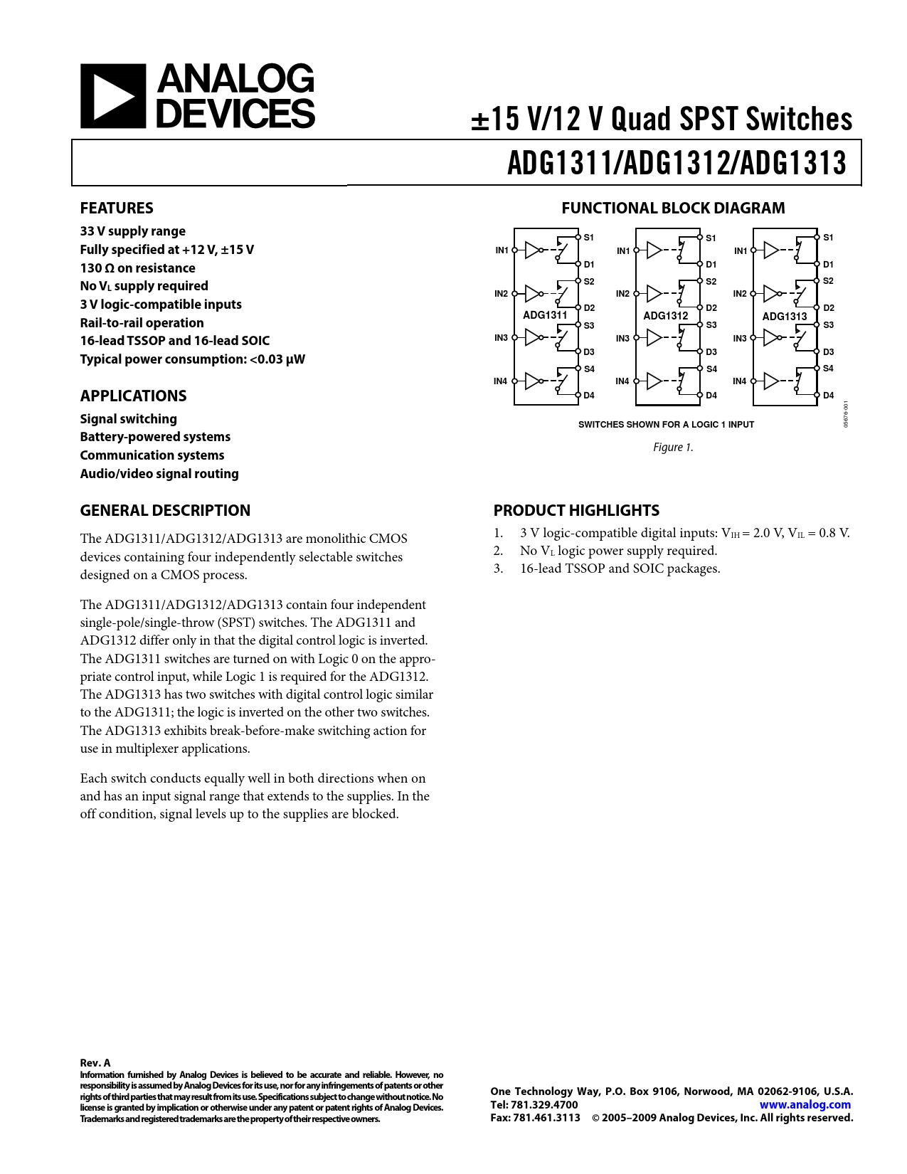 ±15 V/12 V Quad SPST Switches. ADG1311/ADG1312/ADG1313. FEATURES. FUNCTIONAL BLOCK DIAGRAM. 33 V supply range