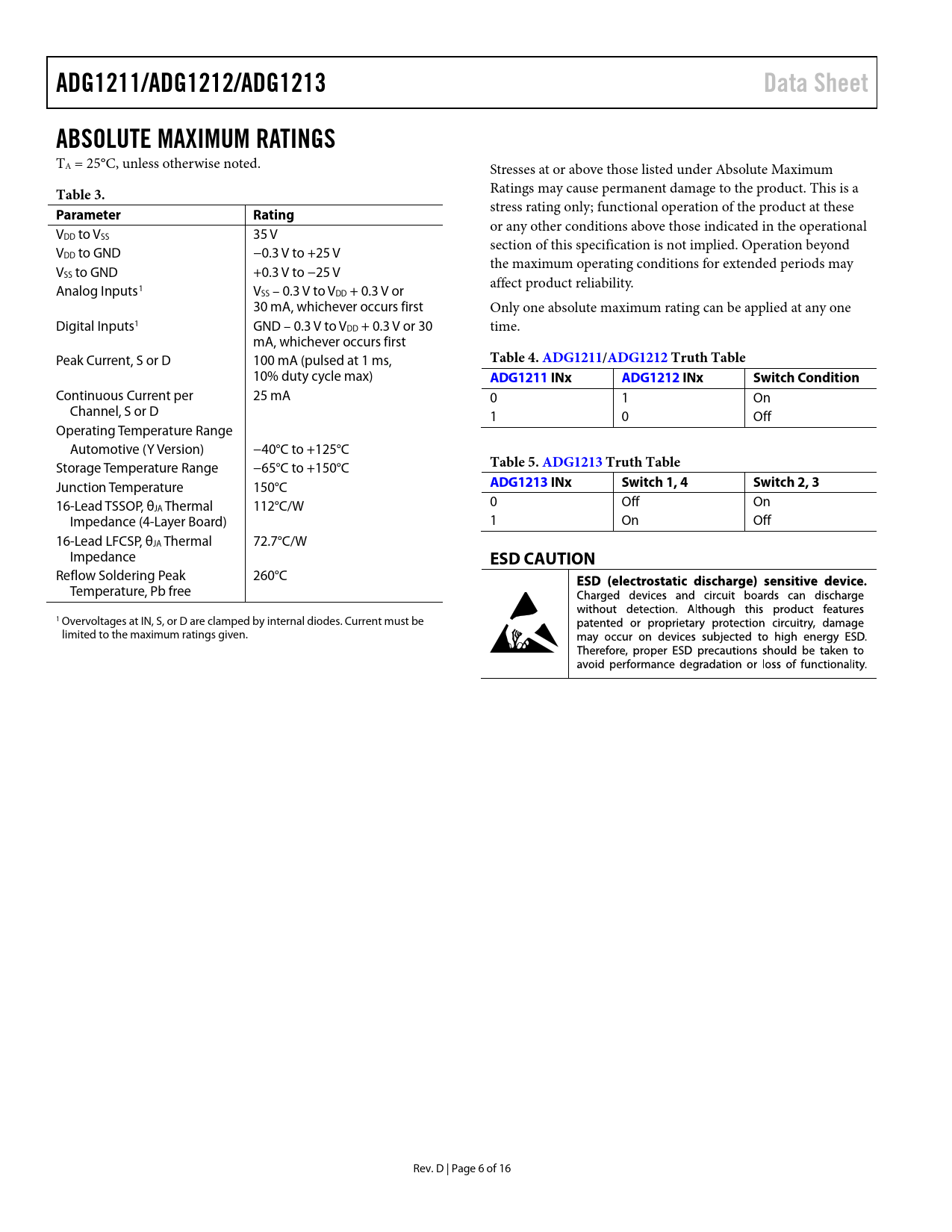 ADG1211/ADG1212/ADG1213Data SheetABSOLUTE MAXIMUM RATINGS TA = 25°C, unless otherwise noted. Stresses at or above those listed under Absolute Maximum Table 3. Ratings may cause permanent damage to the product. This is a ParameterRating stress rating only; functional operation of the product at these or any other conditions above those indicated in the operational VDD to VSS 35 V section of this specification is not implied. Operation beyond VDD to GND −0.3 V to +25 V the maximum operating conditions for extended periods may VSS to GND +0.3 V to −25 V affect product reliability. Analog Inputs1 VSS – 0.3 V to VDD + 0.3 V or 30 mA, whichever occurs first Only one absolute maximum rating can be applied at any one Digital Inputs1 GND – 0.3 V to VDD + 0.3 V or 30 time. mA, whichever occurs first Peak Current, S or D 100 mA (pulsed at 1 ms, Table 4. ADG1211/ADG1212 Truth Table 10% duty cycle max) ADG1211 INxADG1212 INxSwitch Condition Continuous Current per 25 mA 0 1 On Channel, S or D 1 0 Off Operating Temperature Range Automotive (Y Version) −40°C to +125°C Storage Temperature Range −65°C to +150°C Table 5. ADG1213 Truth Table Junction Temperature 150°C ADG1213 INxSwitch 1, 4Switch 2, 3 16-Lead TSSOP, θ 0 Off On JA Thermal 112°C/W Impedance (4-Layer Board) 1 On Off 16-Lead LFCSP, θ JA Thermal 72.7°C/W Impedance ESD CAUTION Reflow Soldering Peak 260°C Temperature, Pb free 1 Overvoltages at IN, S, or D are clamped by internal diodes. Current must be limited to the maximum ratings given. Rev. D | Page 6 of 16 Document Outline FEATURES APPLICATIONS FUNCTIONAL BLOCK DIAGRAM GENERAL DESCRIPTION PRODUCT HIGHLIGHTS REVISION HISTORY SPECIFICATIONS DUAL SUPPLY SINGLE SUPPLY ABSOLUTE MAXIMUM RATINGS ESD CAUTION PIN CONFIGURATIONS AND FUNCTION DESCRIPTIONS TERMINOLOGY TYPICAL PERFORMANCE CHARACTERISTICS TEST CIRCUITS OUTLINE DIMENSIONS ORDERING GUIDE