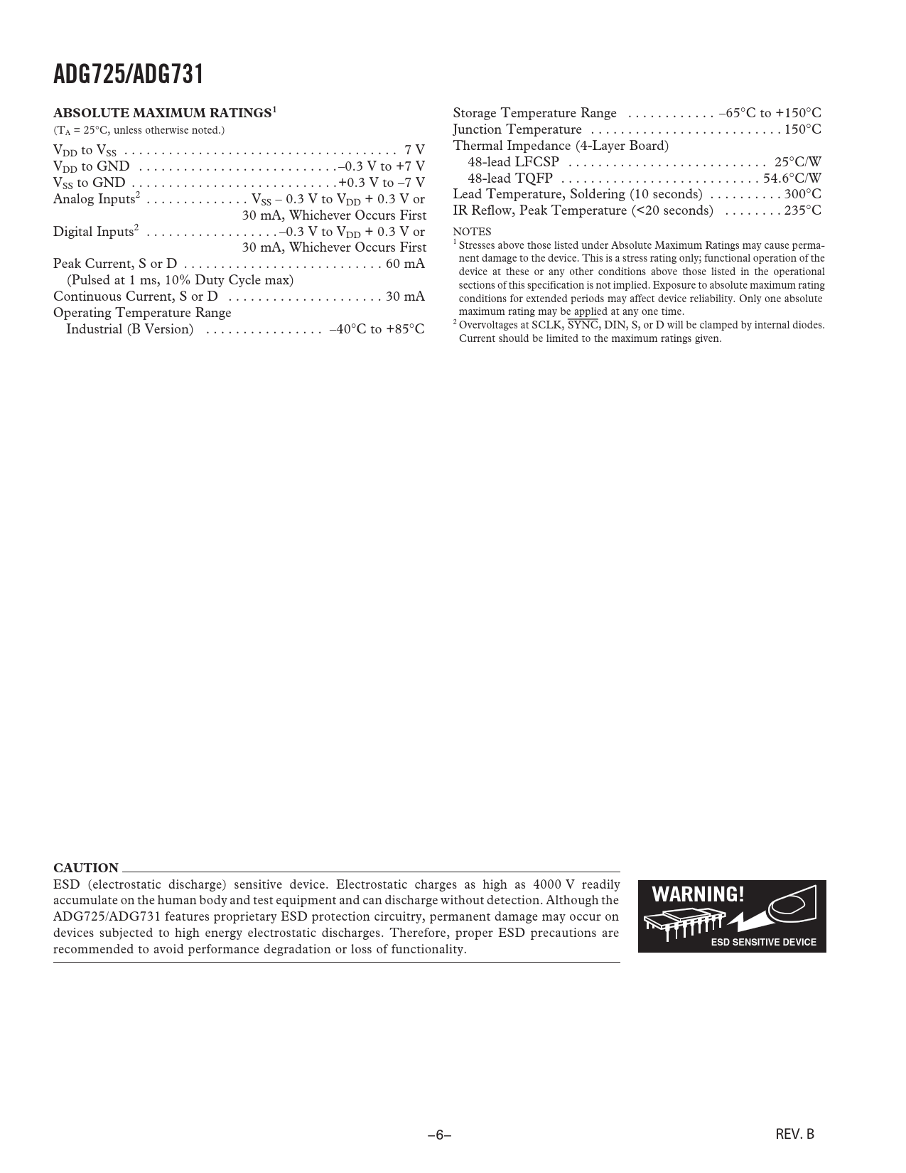 ADG725/ADG731ABSOLUTE MAXIMUM RATINGS1 Storage Temperature Range . –65°C to +150°C (T Junction Temperature . 150°C A = 25°C, unless otherwise noted.) V Thermal Impedance (4-Layer Board) DD to VSS . 7 V V 48-lead LFCSP . 25°C/W DD to GND . –0.3 V to +7 V V 48-lead TQFP . 54.6°C/W SS to GND . +0.3 V to –7 V Analog Inputs2 . V Lead Temperature, Soldering (10 seconds) . 300°C SS – 0.3 V to VDD + 0.3 V or 30 mA, Whichever Occurs First IR Reflow, Peak Temperature (<20 seconds) . 235°C Digital Inputs2 . –0.3 V to VDD + 0.3 V or NOTES 30 mA, Whichever Occurs First 1 Stresses above those listed under Absolute Maximum Ratings may cause perma- Peak Current, S or D . 60 mA nent damage to the device. This is a stress rating only; functional operation of the device at these or any other conditions above those listed in the operational (Pulsed at 1 ms, 10% Duty Cycle max) sections of this specification is not implied. Exposure to absolute maximum rating Continuous Current, S or D . 30 mA conditions for extended periods may affect device reliability. Only one absolute Operating Temperature Range maximum rating may be applied at any one time. 2 Industrial (B Version) . –40°C to +85°C Overvoltages at SCLK, SYNC, DIN, S, or D will be clamped by internal diodes. Current should be limited to the maximum ratings given. CAUTION ESD (electrostatic discharge) sensitive device. Electrostatic charges as high as 4000 V readily accumulate on the human body and test equipment and can discharge without detection. Although the WARNING! ADG725/ADG731 features proprietary ESD protection circuitry, permanent damage may occur on devices subjected to high energy electrostatic discharges. Therefore, proper ESD precautions are ESD SENSITIVE DEVICE recommended to avoid performance degradation or loss of functionality. –6– REV. B