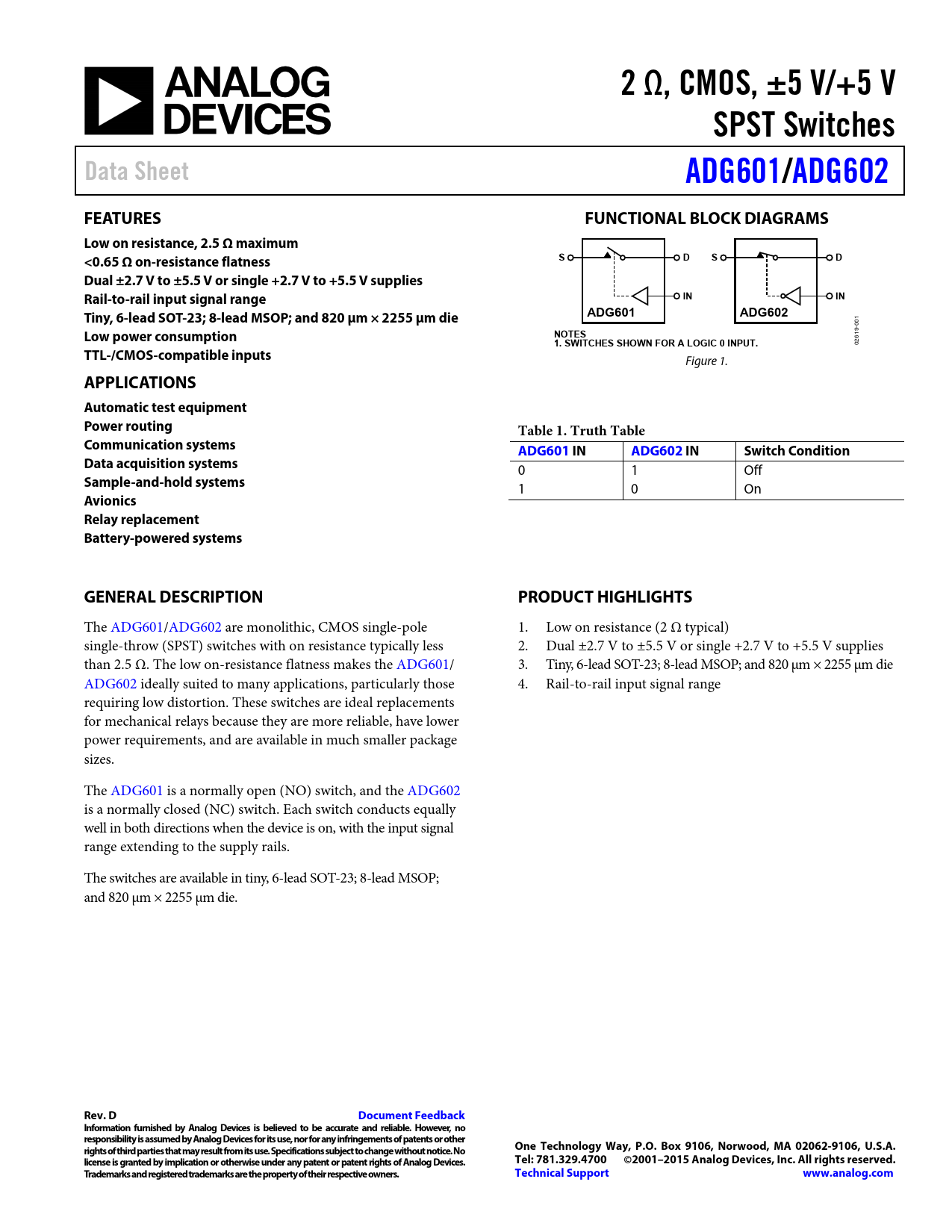 2 Ω, CMOS, ±5 V/+5 V. SPST Switches. Data Sheet. ADG601. /ADG602. FEATURES. FUNCTIONAL BLOCK DIAGRAMS