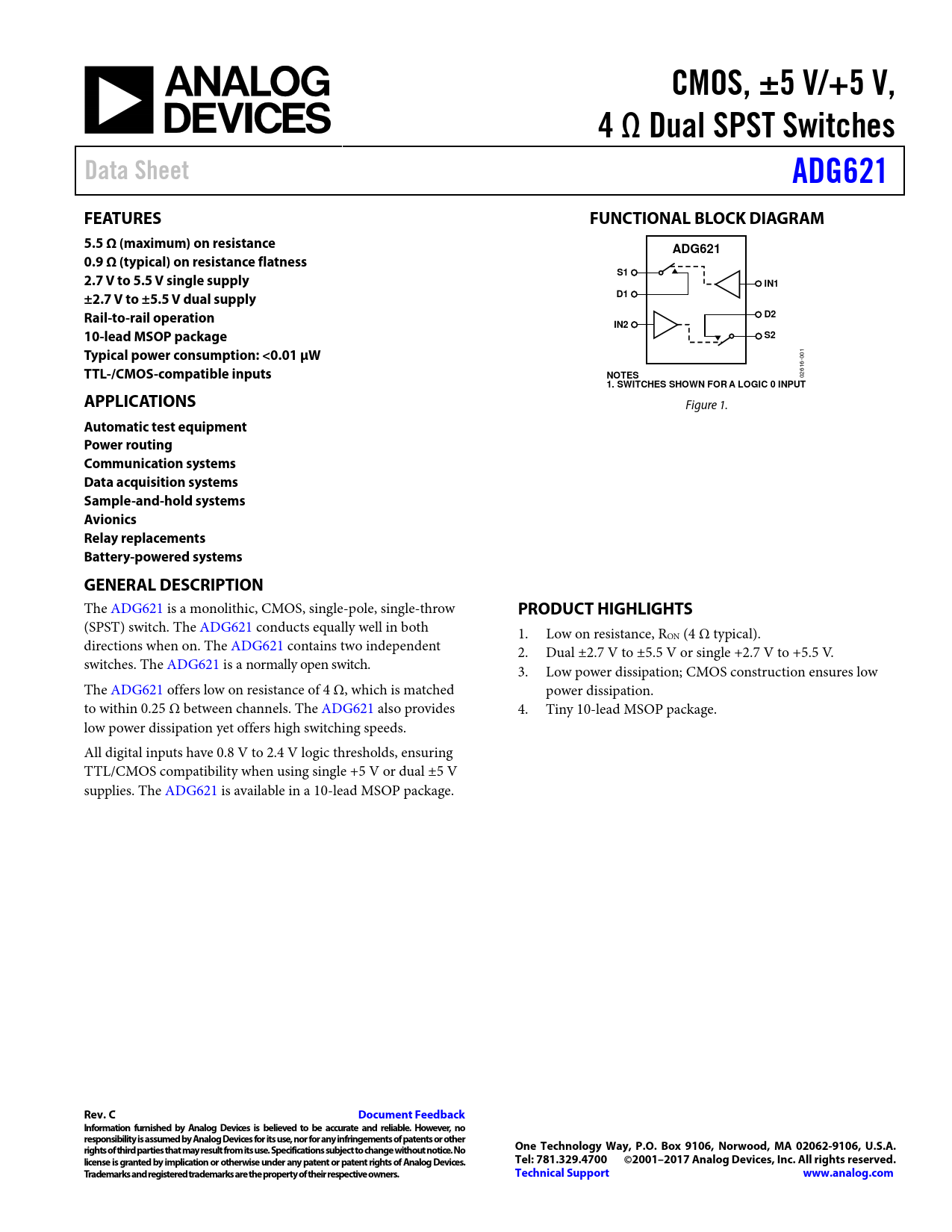 CMOS, ±5 V/+5 V,. 4 Ω Dual SPST Switches. Data Sheet. ADG621. FEATURES. FUNCTIONAL BLOCK DIAGRAM. 5.5 Ω (maximum) on resistance