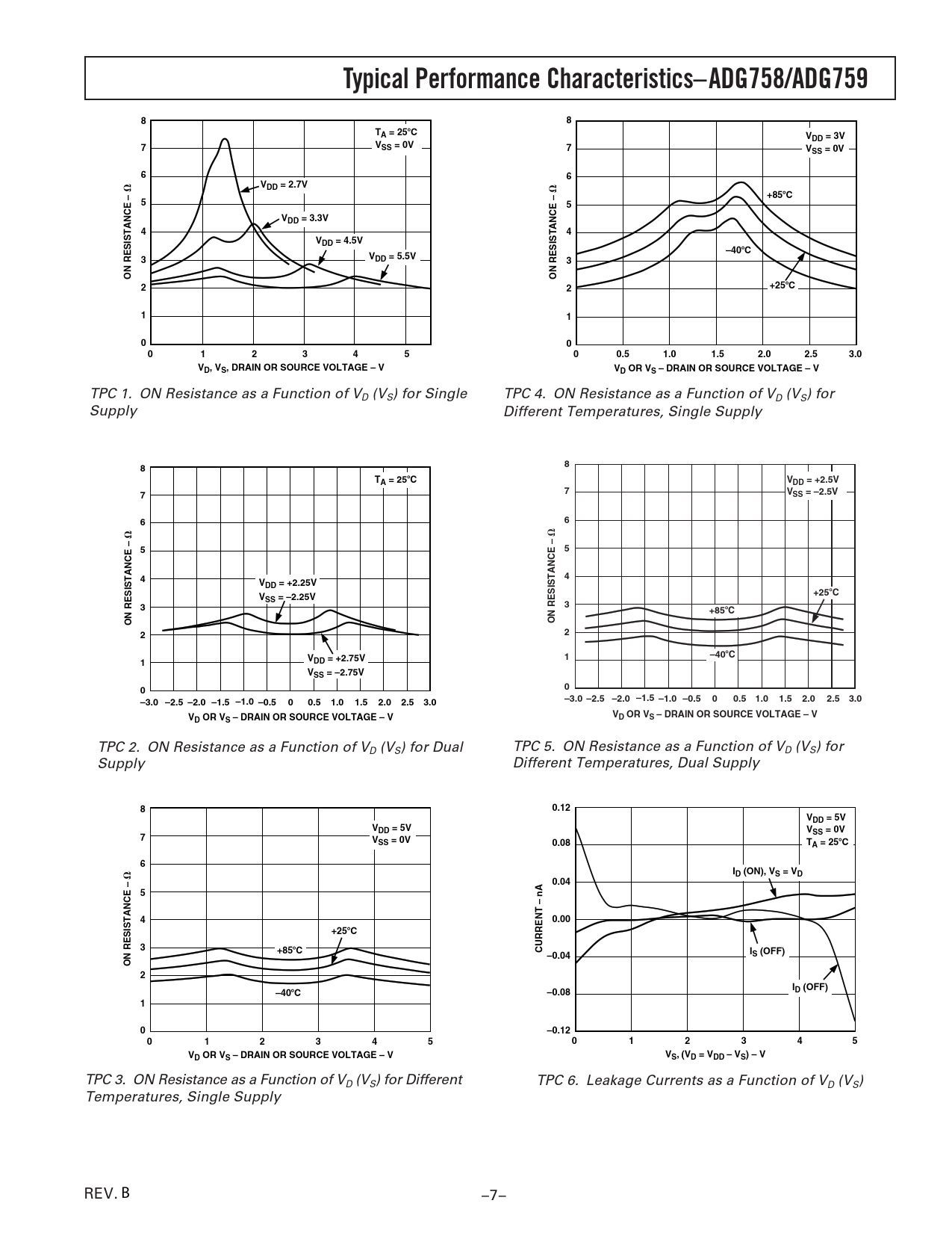 TPC 3. ON Resistance as a Function of VD (VS) for Different TPC 6. Leakage Currents as a Function of VD (VS) Temperatures, Single Supply REV. B –7–