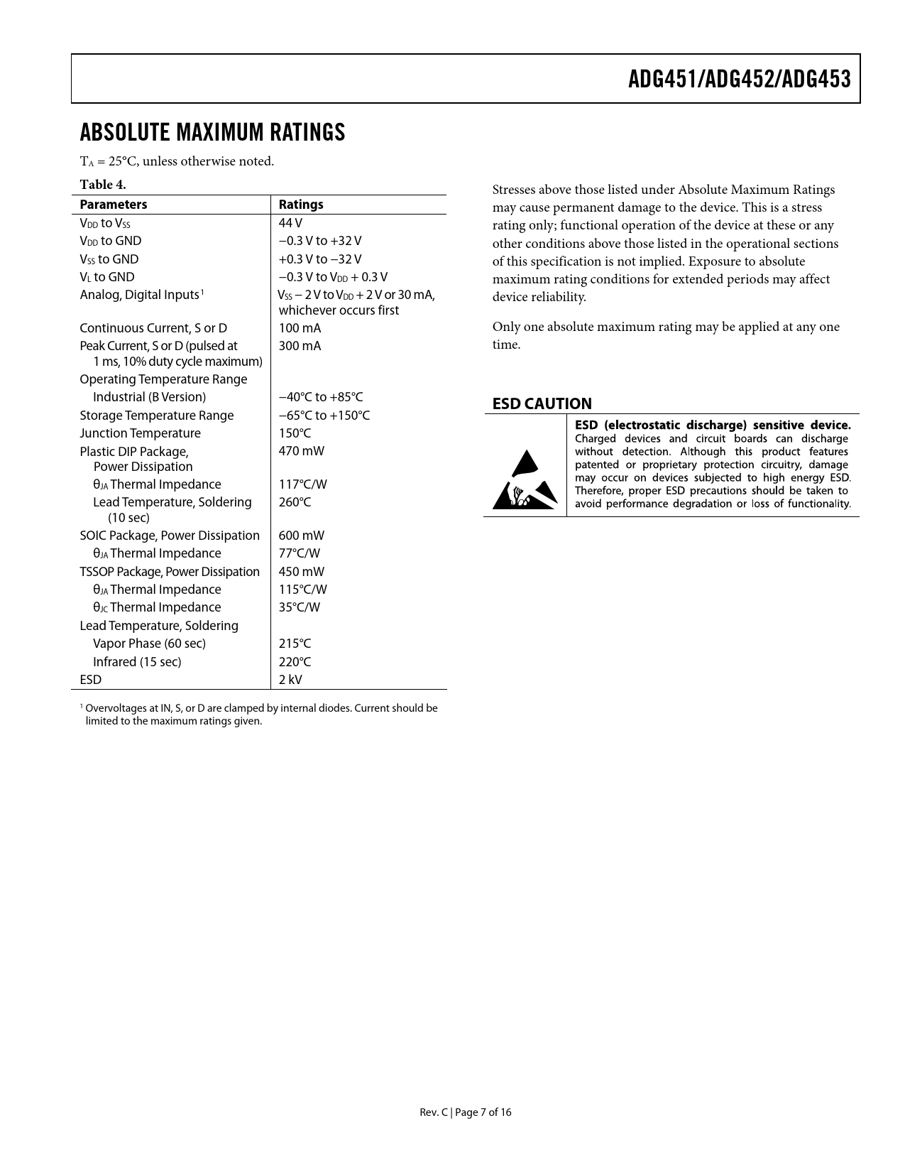 ADG451/ADG452/ADG453 ABSOLUTE MAXIMUM RATINGS Table 4 Parameters Ratings ESD CAUTION