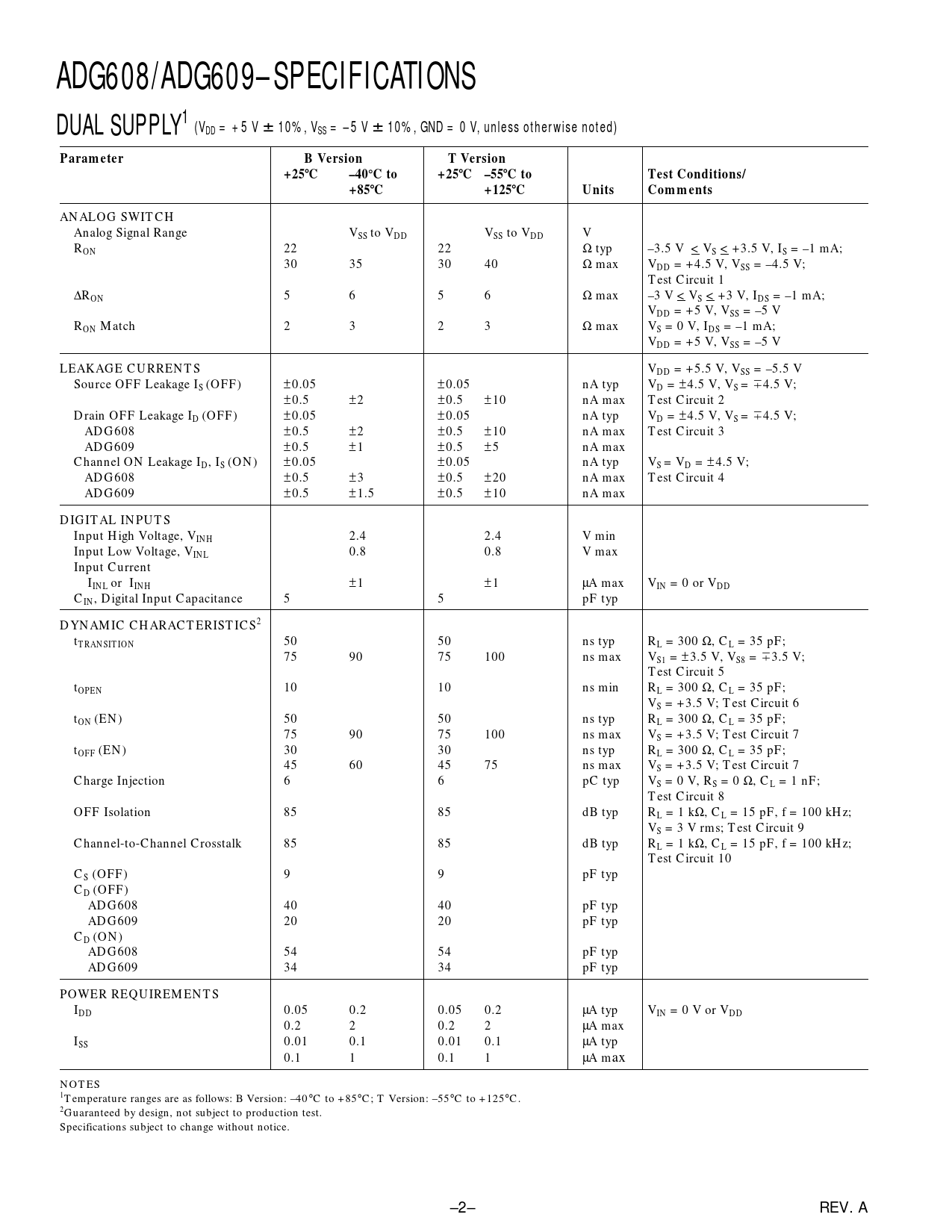 ADG608/ADG609–SPECIFICATIONS DUAL SUPPLY1 (VDD = +5 V 10%, VSS = –5 V 10%, GND = 0 V, unless otherwise noted) Parameter