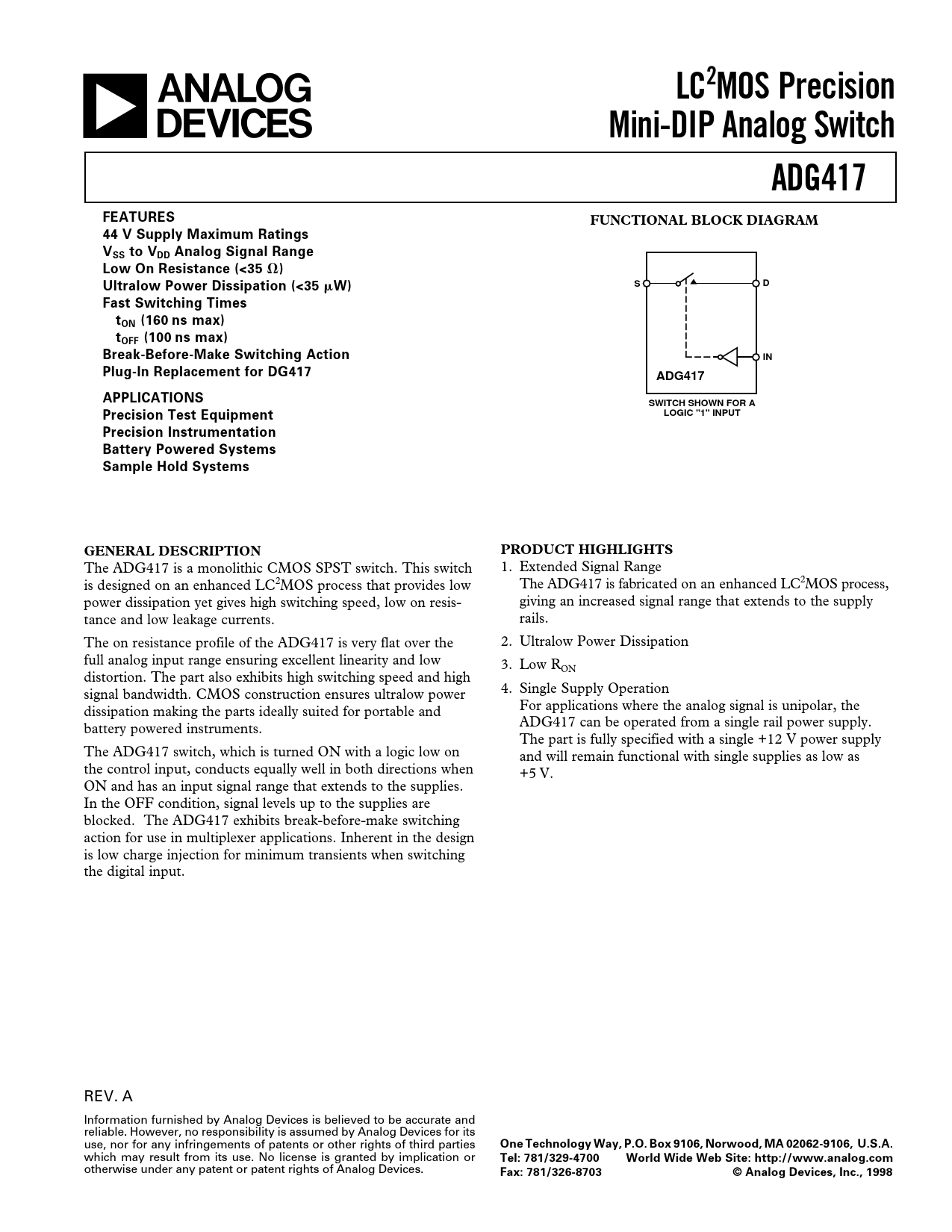 LC2MOS Precision Mini-DIP Analog Switch ADG417 FEATURES FUNCTIONAL BLOCK DIAGRAM 44 V Supply Maximum Ratings VSS to VDD Analog Signal Range Low On Resistance (<35