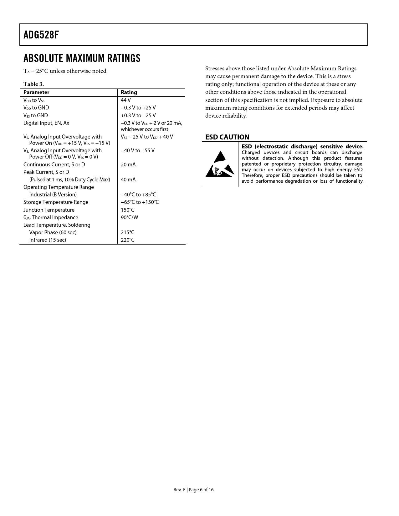 ADG528FABSOLUTE MAXIMUM RATINGS T Stresses above those listed under Absolute Maximum Ratings A = 25°C unless otherwise noted. may cause permanent damage to the device. This is a stress Table 3. rating only; functional operation of the device at these or any Parameter Rating other conditions above those indicated in the operational VDD to VSS 44 V section of this specification is not implied. Exposure to absolute VDD to GND −0.3 V to +25 V maximum rating conditions for extended periods may affect VSS to GND +0.3 V to −25 V device reliability. Digital Input, EN, Ax −0.3 V to VDD + 2 V or 20 mA, whichever occurs first VS, Analog Input Overvoltage with VSS − 25 V to VDD + 40 V ESD CAUTION Power On (VDD = +15 V, VSS = −15 V) VS, Analog Input Overvoltage with −40 V to +55 V Power Off (VDD = 0 V, VSS = 0 V) Continuous Current, S or D 20 mA Peak Current, S or D (Pulsed at 1 ms, 10% Duty Cycle Max) 40 mA Operating Temperature Range Industrial (B Version) −40°C to +85°C Storage Temperature Range −65°C to +150°C Junction Temperature 150°C θJA, Thermal Impedance 90°C/W Lead Temperature, Soldering Vapor Phase (60 sec) 215°C Infrared (15 sec) 220°C Rev. F | Page 6 of 16 Document Outline FEATURES APPLICATIONS FUNCTIONAL BLOCK DIAGRAM GENERAL DESCRIPTION PRODUCT HIGHLIGHTS TABLE OF CONTENTS REVISION HISTORY SPECIFICATIONS DUAL SUPPLY TRUTH TABLE TIMING DIAGRAMS ABSOLUTE MAXIMUM RATINGS ESD CAUTION PIN CONFIGURATION AND FUNCTION DESCRIPTIONS TYPICAL PERFORMANCE CHARACTERISTICS TERMINOLOGY THEORY OF OPERATION TEST CIRCUITS OUTLINE DIMENSIONS ORDERING GUIDE