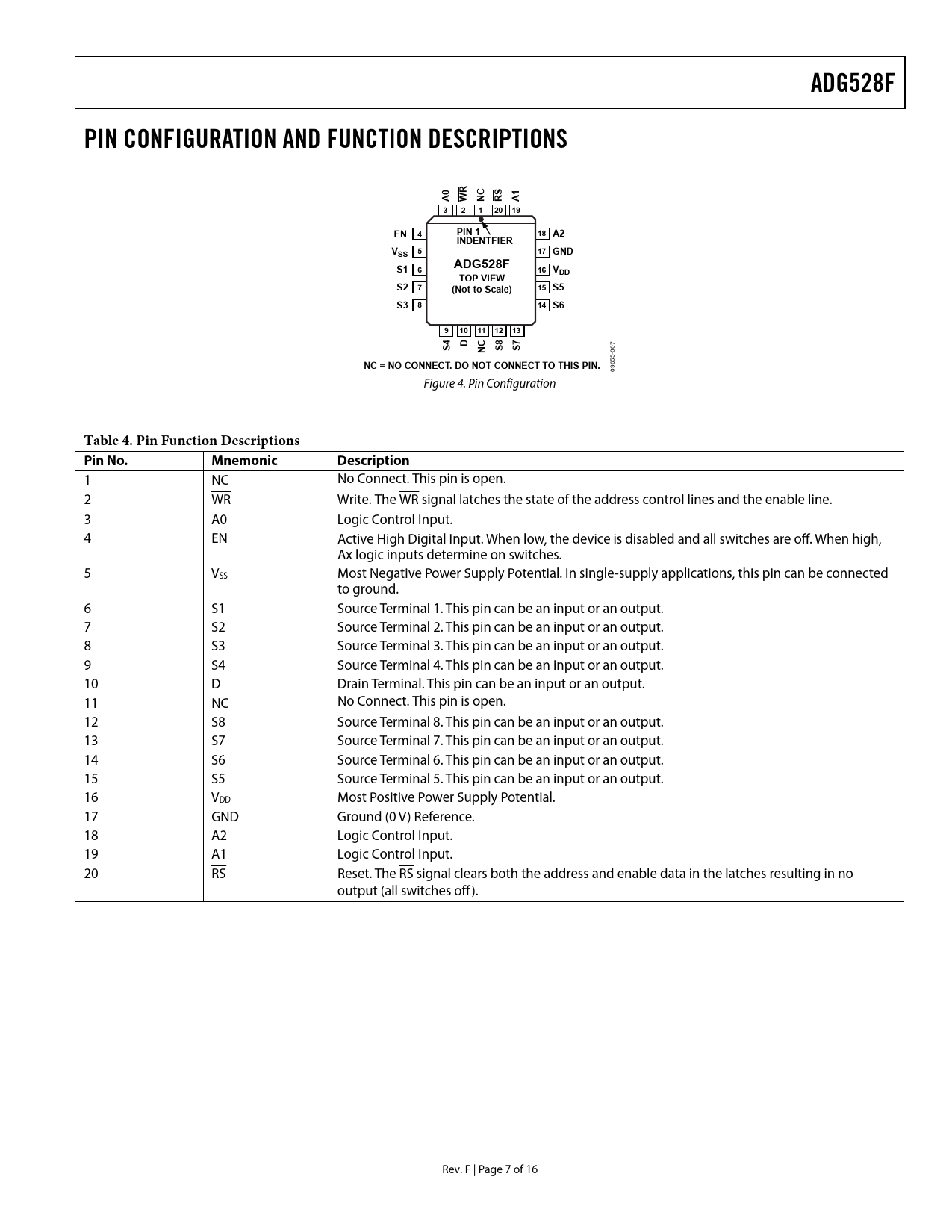 ADG528FPIN CONFIGURATION AND FUNCTION DESCRIPTIONSA0WRNCRSA13212019EN4PIN 118 A2INDENTFIERV517SSGNDADG528FS1 616 VDDTOP VIEWS2 715(Not to Scale)S5S3 814 S6910111213S4D 7 NCS8S7 00 5- NC = NO CONNECT. DO NOT CONNECT TO THIS PIN. 65 09 Figure 4. Pin Configuration Table 4. Pin Function Descriptions Pin No.MnemonicDescription 1 NC No Connect. This pin is open. 2 WR Write. The WR signal latches the state of the address control lines and the enable line. 3 A0 Logic Control Input. 4 EN Active High Digital Input. When low, the device is disabled and all switches are off. When high, Ax logic inputs determine on switches. 5 VSS Most Negative Power Supply Potential. In single-supply applications, this pin can be connected to ground. 6 S1 Source Terminal 1. This pin can be an input or an output. 7 S2 Source Terminal 2. This pin can be an input or an output. 8 S3 Source Terminal 3. This pin can be an input or an output. 9 S4 Source Terminal 4. This pin can be an input or an output. 10 D Drain Terminal. This pin can be an input or an output. 11 NC No Connect. This pin is open. 12 S8 Source Terminal 8. This pin can be an input or an output. 13 S7 Source Terminal 7. This pin can be an input or an output. 14 S6 Source Terminal 6. This pin can be an input or an output. 15 S5 Source Terminal 5. This pin can be an input or an output. 16 VDD Most Positive Power Supply Potential. 17 GND Ground (0 V) Reference. 18 A2 Logic Control Input. 19 A1 Logic Control Input. 20 RS Reset. The RS signal clears both the address and enable data in the latches resulting in no output (all switches off ). Rev. F | Page 7 of 16 Document Outline FEATURES APPLICATIONS FUNCTIONAL BLOCK DIAGRAM GENERAL DESCRIPTION PRODUCT HIGHLIGHTS TABLE OF CONTENTS REVISION HISTORY SPECIFICATIONS DUAL SUPPLY TRUTH TABLE TIMING DIAGRAMS ABSOLUTE MAXIMUM RATINGS ESD CAUTION PIN CONFIGURATION AND FUNCTION DESCRIPTIONS TYPICAL PERFORMANCE CHARACTERISTICS TERMINOLOGY THEORY OF OPERATION TEST CIRCUITS OUTLINE DIMENSIONS ORDERING GUIDE
