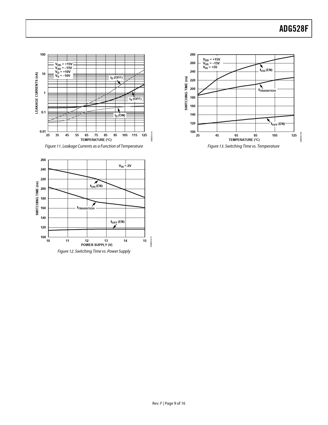 ADG528F. 100. 280. VDD = +15V. 260. DD = +15V. SS = –15V. IN = +5V. 240. ON (EN). D = +10V. VS = –10V. ID (OFF). n 220. E IM 200. RRE. TRANSITION. G T. 180