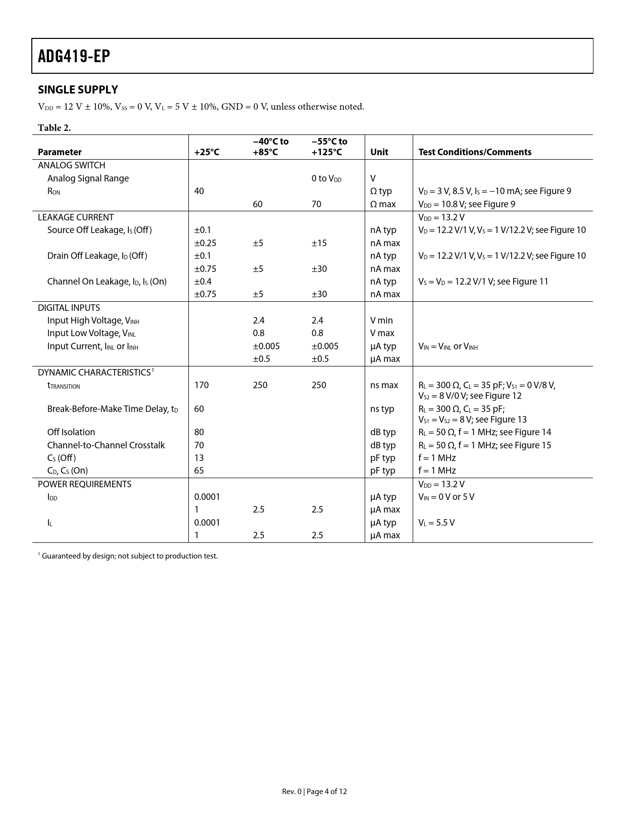 页数 / 页12 / 4 — ADG419-EP. SINGLE SUPPLY. Table 2. −40°C to. −55°C to. Parameter. +25°C. …