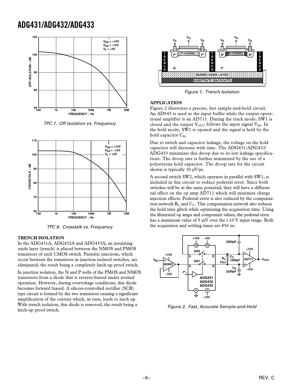 An AD845 is used as the input buffer while the output opera- tional amplifier is an AD711. During the track mode, SW1 is TPC 7. Off Isolation vs. Frequency closed and the output VOUT follows the input signal VIN. In the hold mode, SW1 is opened and the signal is held by the hold capacitor CH.