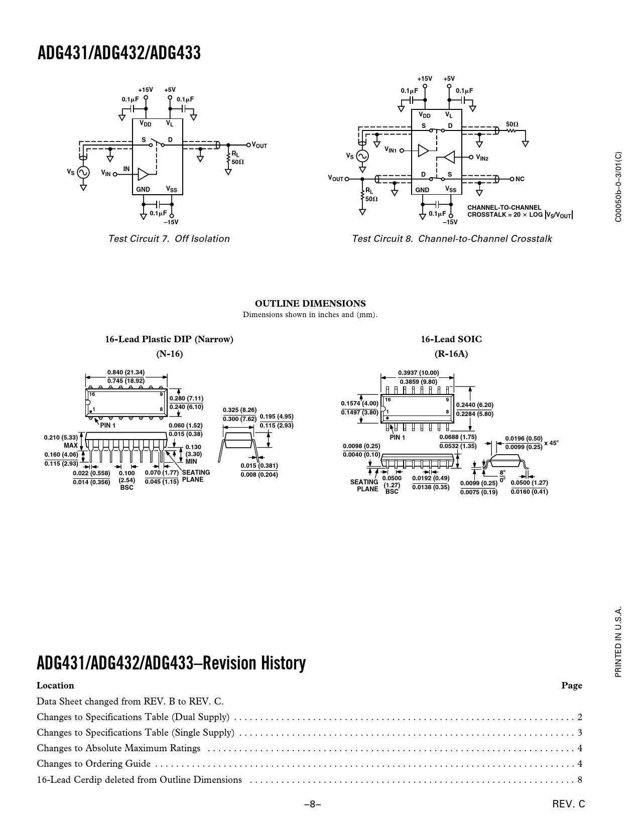 16-Lead Plastic DIP (Narrow) 16-Lead SOIC (N-16) (R-16A) 0.840 (21.34) 0.3937 (10.00) 0.745 (18.92) 0.3859 (9.80) 16 9 0.280 (7.11) 16 9 0.1574 (4.00) 0.2440 (6.20) 1 8 0.240 (6.10) 0.325 (8.26) 1 8 0.1497 (3.80) 0.2284 (5.80) 0.300 (7.62) 0.195 (4.95) PIN 1 0.060 (1.52) 0.115 (2.93) 0.015 (0.38) 0.210 (5.33) PIN 1 0.0688 (1.75) 0.0196 (0.50) MAX x 45 0.130 0.0098 (0.25) 0.0532 (1.35) 0.0099 (0.25) 0.160 (4.06) (3.30) 0.0040 (0.10) MIN 0.115 (2.93) 0.015 (0.381) 0.022 (0.558) 0.100 0.070 (1.77) SEATING 0.008 (0.204) 8 (2.54) PLANE 0.0500 0.0192 (0.49) 0.014 (0.356) 0.045 (1.15) SEATING 0 0.0099 (0.25) 0.0500 (1.27) BSC (1.27) PLANE 0.0138 (0.35) BSC 0.0075 (0.19) 0.0160 (0.41) ADG431/ADG432/ADG433–Revision History