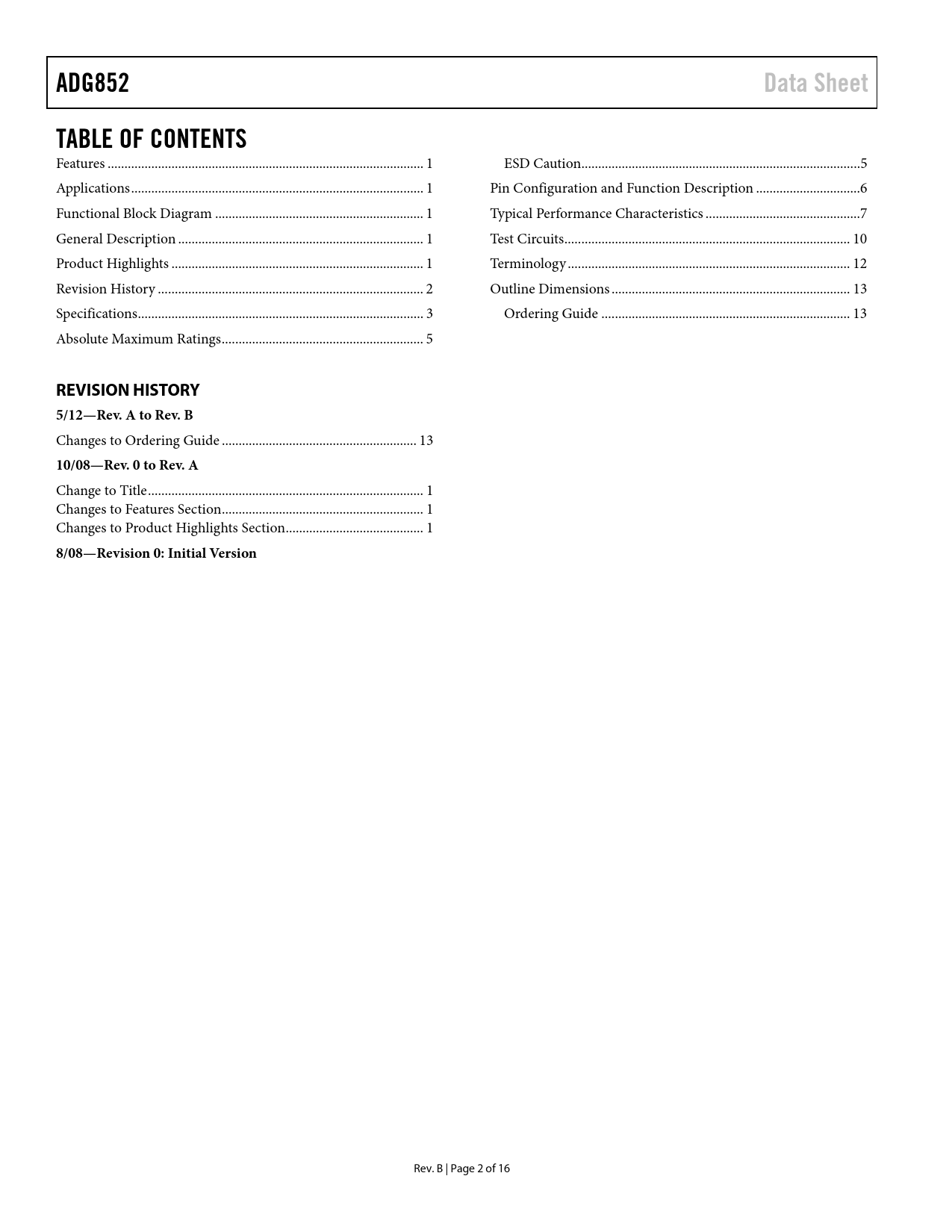 页数 / 页16 / 2 — ADG852. Data Sheet. TABLE OF CONTENTS. REVISION HISTORY 5/12—Rev. A to …