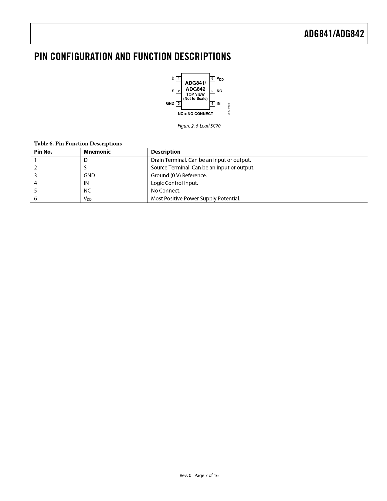ADG841/ADG842 PIN CONFIGURATION AND FUNCTION DESCRIPTIONS D 1 6 VDD ADG841/ ADG842 S 2 5 NC TOP VIEW (Not to Scale) GND 3 4 IN NC = NO CONNECT