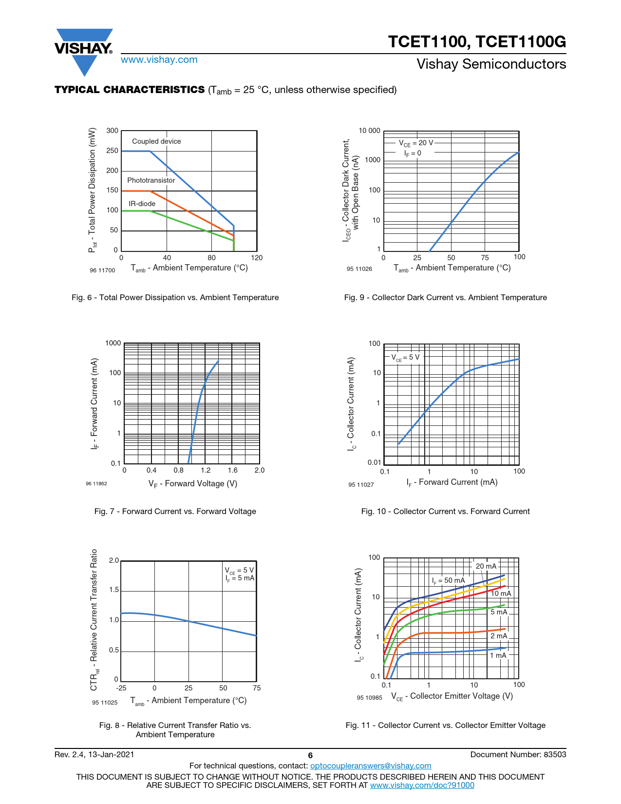 TCET1100, TCET1100G www.vishay.com Vishay Semiconductors TYPICAL CHARACTERISTICS (Tamb = 25 °C, unless otherwise specified) 300 10 000 Coupled device V = 20 V CE 250 I = 0 F 1000 200 Phototransistor 150 100 IR-diode 100 10 - Collector Dark Current, 50 with Open Base (nA) - Total Power Dissipation (mW) I CEO totP 0 1 0 40 80 120 0 25 50 75 100 T - Ambient Temperature (°C) 96 11700 T - Ambient Temperature (°C) amb 95 11026 amb Fig. 6 - Total Power Dissipation vs. Ambient Temperature Fig. 9 - Collector Dark Current vs. Ambient Temperature 1000 100 V = 5 V CE 100 10 10 1 1 0.1 - Forward Current (mA) - Collector Current (mA) I F I C 0.1 0.01 0 0.4 0.8 1.2 1.6 2.0 0.1 1 10 100 96 11862 V I - Forward Current (mA) F - Forward Voltage (V) 95 11027 F Fig. 7 - Forward Current vs. Forward Voltage Fig. 10 - Collector Current vs. Forward Current 2.0 100 20 mA V = 5 V CE I = 5 mA F I = 50 mA F 1.5 10 mA 10 5 mA 1.0 1 2 mA 0.5 - Collector Current (mA) 1 mA I C - Relative Current Transfer Ratio rel 0 0.1 CTR 100 -25 0 25 50 75 0.1 1 10 95 10985 V - Collector Emitter Voltage (V) 95 11025 T - Ambient Temperature (°C) CE amb Fig. 8 - Relative Current Transfer Ratio vs. Fig. 11 - Collector Current vs. Collector Emitter Voltage Ambient Temperature Rev. 2.4, 13-Jan-2021 6 Document Number: 83503 For technical questions, contact: optocoupleranswers@vishay.com THIS DOCUMENT IS SUBJECT TO CHANGE WITHOUT NOTICE. THE PRODUCTS DESCRIBED HEREIN AND THIS DOCUMENT ARE SUBJECT TO SPECIFIC DISCLAIMERS, SET FORTH AT www.vishay.com/doc?91000