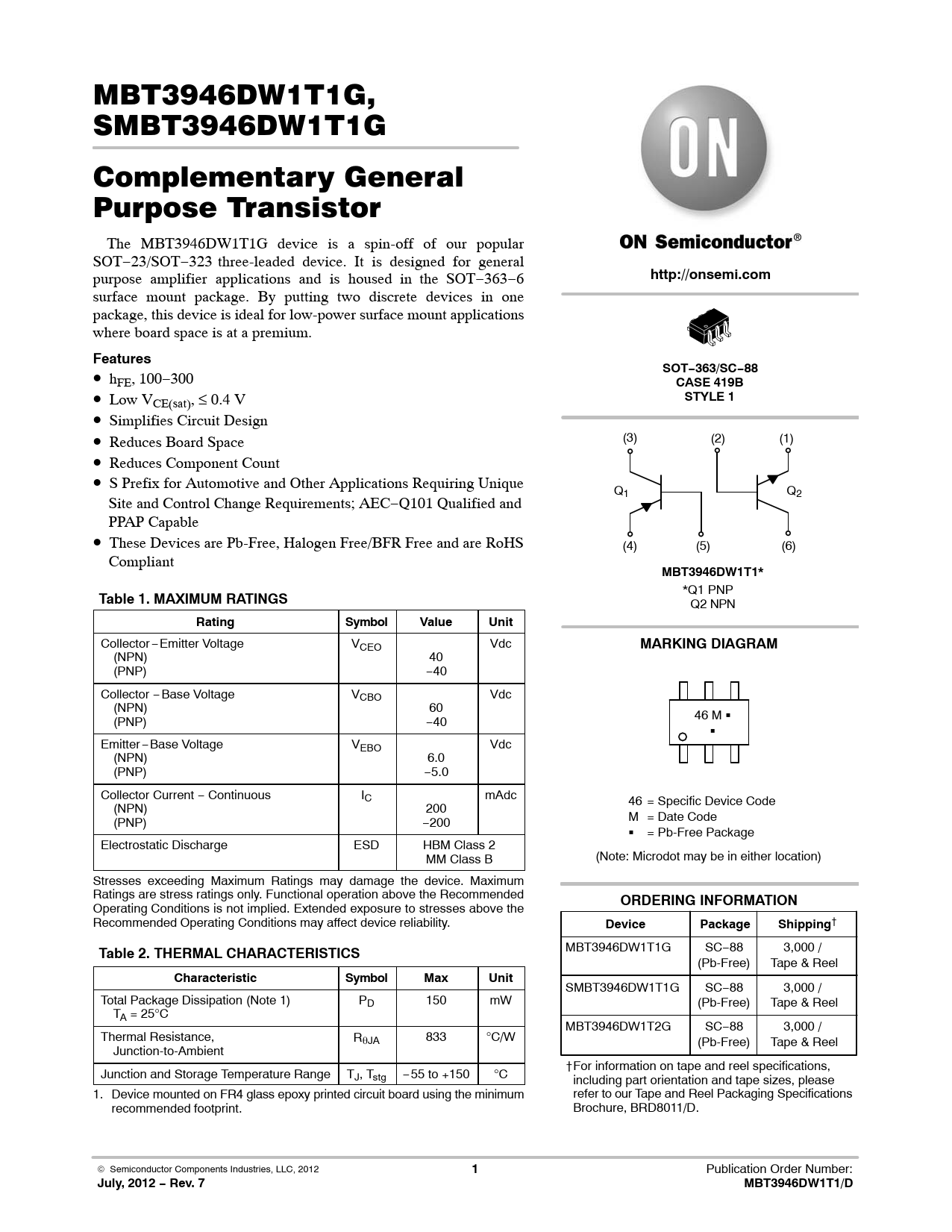 http://onsemi.com. Features. SOT−363/SC−88. CASE 419B. STYLE 1. MBT3946DW1T1*. Table 1. MAXIMUM RATINGS. Rating. Symbol. Value. Unit