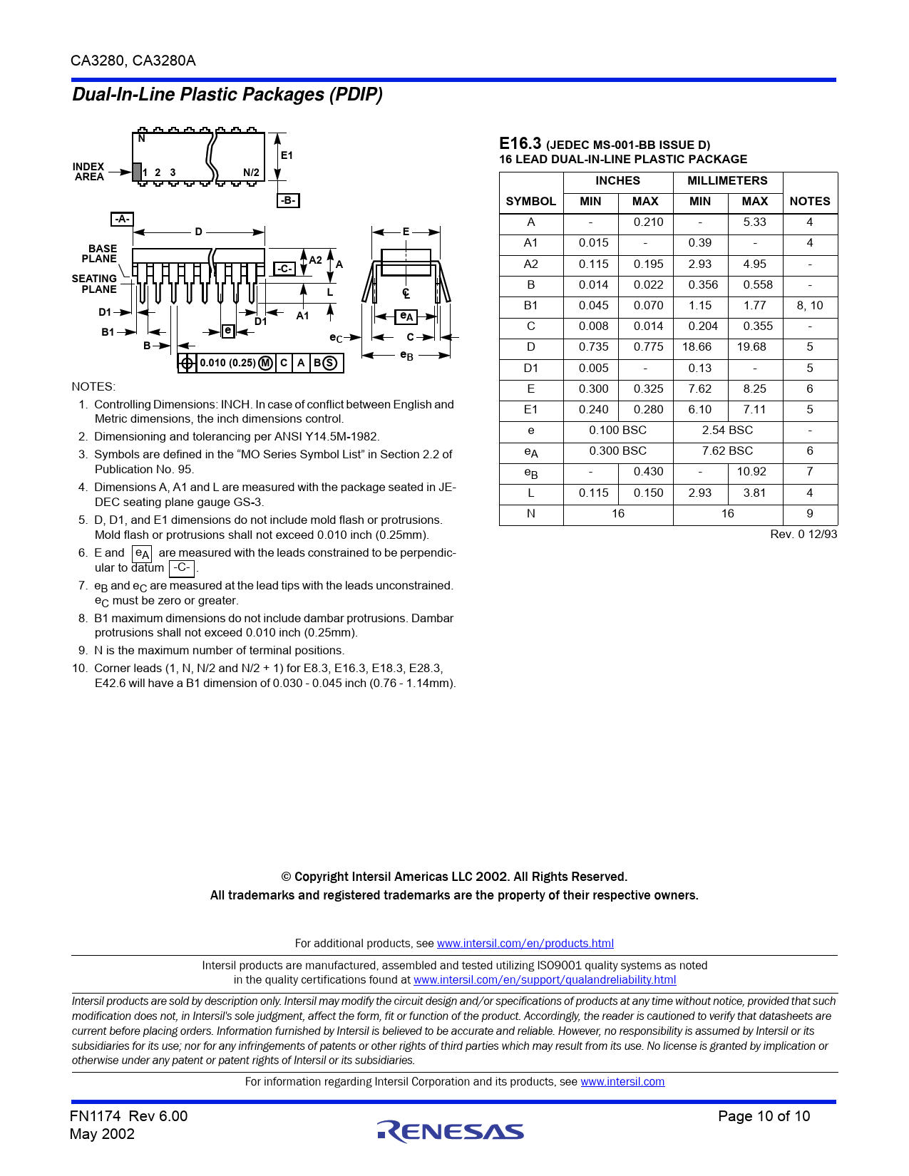 3. 5. D, D1, and E1 dimensions do not include mold flash or protrusions. N 16 16 9 Mold flash or protrusions shall not exceed 0.010 inch (0.25mm). Rev. 0 12/93 6. E and eA are measured with the leads constrained to be perpendic- ular to datum -C- . 7. eB and eC are measured at the lead tips with the leads unconstrained. eC must be zero or greater. 8. B1 maximum dimensions do not include dambar protrusions. Dambar protrusions shall not exceed 0.010 inch (0.25mm). 9. N is the maximum number of terminal positions. 10. Corner leads (1, N, N/2 and N/2 + 1) for E8.3, E16.3, E18.3, E28.3, E42.6 will have a B1 dimension of 0.030 - 0.045 inch (0.76 - 1.14mm). © Copyright Intersil Americas LLC 2002. All Rights Reserved. All trademarks and registered trademarks are the property of their respective owners. For additional products, see www.intersil.com/en/products.html Intersil products are manufactured, assembled and tested utilizing ISO9001 quality systems as noted in the quality certifications found at www.intersil.com/en/support/qualandreliability.html Intersil products are sold by description only. Intersil may modify the circuit design and/or specifications of products at any time without notice, provided that such modification does not, in Intersil's sole judgment, affect the form, fit or function of the product. Accordingly, the reader is cautioned to verify that datasheets are current before placing orders. Information furnished by Intersil is believed to be accurate and reliable. However, no responsibility is assumed by Intersil or its subsidiaries for its use; nor for any infringements of patents or other rights of third parties which may result from its use. No license is granted by implication or otherwise under any patent or patent rights of Intersil or its subsidiaries. For information regarding Intersil Corporation and its products, see www.intersil.com FN1174 Rev 6.00 Page 10 of 10 May 2002