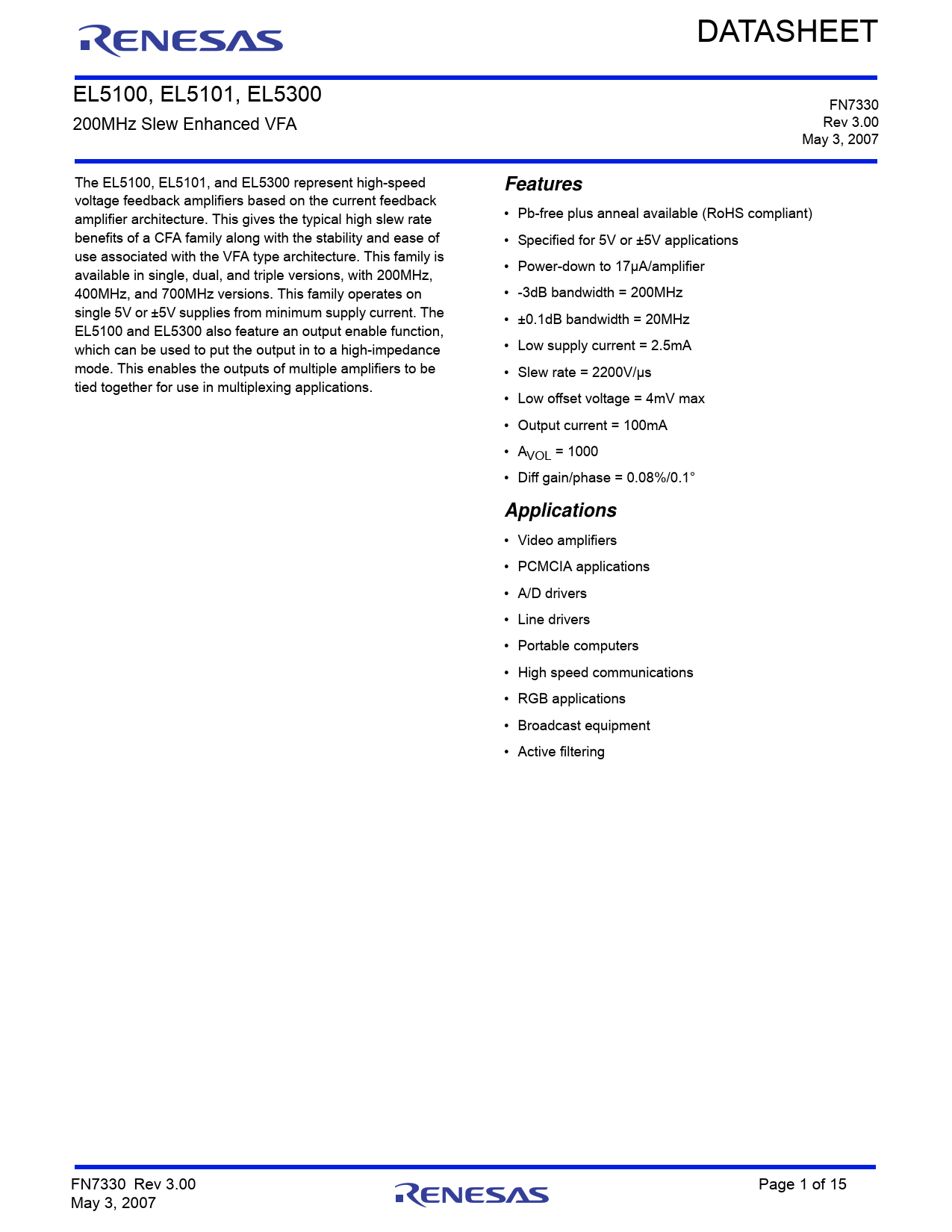 Datasheet EL5100, EL5101, EL5300 (Renesas)