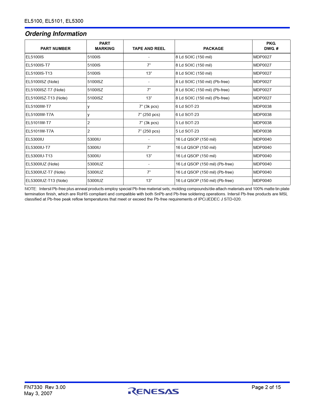 EL5100IS 5100IS - 8 Ld SOIC (150 mil) MDP0027 EL5100IS-T7 5100IS 7” 8 Ld SOIC (150 mil) MDP0027 EL5100IS-T13 5100IS 13” 8 Ld SOIC (150 mil) MDP0027 EL5100ISZ (Note) 5100ISZ - 8 Ld SOIC (150 mil) (Pb-free) MDP0027 EL5100ISZ-T7 (Note) 5100ISZ 7” 8 Ld SOIC (150 mil) (Pb-free) MDP0027 EL5100ISZ-T13 (Note) 5100ISZ 13” 8 Ld SOIC (150 mil) (Pb-free) MDP0027 EL5100IW-T7 y 7” (3k pcs) 6 Ld SOT-23 MDP0038 EL5100IW-T7A y 7” (250 pcs) 6 Ld SOT-23 MDP0038 EL5101IW-T7 2 7” (3k pcs) 5 Ld SOT-23 MDP0038 EL5101IW-T7A 2 7” (250 pcs) 5 Ld SOT-23 MDP0038 EL5300IU 5300IU - 16 Ld QSOP (150 mil) MDP0040 EL5300IU-T7 5300IU 7” 16 Ld QSOP (150 mil) MDP0040 EL5300IU-T13 5300IU 13” 16 Ld QSOP (150 mil) MDP0040 EL5300IUZ (Note) 5300IUZ - 16 Ld QSOP (150 mil) (Pb-free) MDP0040 EL5300IUZ-T7 (Note) 5300IUZ 7” 16 Ld QSOP (150 mil) (Pb-free) MDP0040 EL5300IUZ-T13 (Note) 5300IUZ 13” 16 Ld QSOP (150 mil) (Pb-free) MDP0040 NOTE: Intersil Pb-free plus anneal products employ special Pb-free material sets; molding compounds/die attach materials and 100% matte tin plate termination finish, which are RoHS compliant and compatible with both SnPb and Pb-free soldering operations. Intersil Pb-free products are MSL classified at Pb-free peak reflow temperatures that meet or exceed the Pb-free requirements of IPC/JEDEC J STD-020. FN7330 Rev 3.00 Page 2 of 15 May 3, 2007
