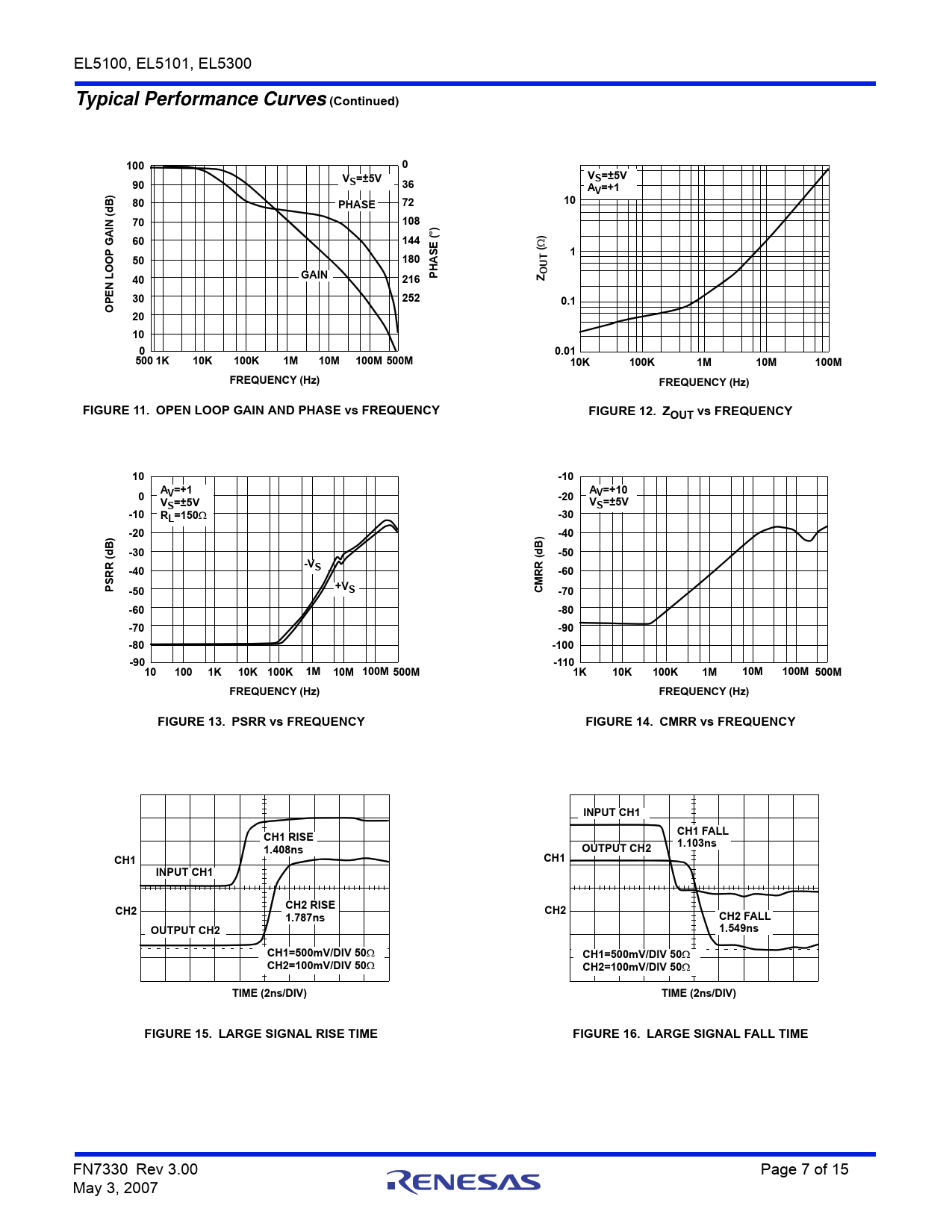 EL5100, EL5101, EL5300 Typical Performance Curves(Continued)1000VVS=±5V90S=±5V36A)V=+1B80PHASE7210(d IN70108(°))GA60144EP(150180TOOOULGAINPHAS216ZN40E P302520.1O20 1000.01500 1K10K100K1M10M100M 500M10K100K1M10M100MFREQUENCY (Hz)FREQUENCY (Hz)FIGURE 11. OPEN LOOP GAIN AND PHASE vs FREQUENCYFIGURE 12. ZOUT vs FREQUENCY10-10AA0V=+1-20V=+10VS=±5VVS=±5V-10RL=150-30-20-40(dB)-30-50-VSRR-40-60PS-50+VSCMRR (dB)-70-60-80-70-90-80-100-90-110101001K10K 100K1M10M 100M 500M1K10K100K1M10M100M 500MFREQUENCY (Hz)FREQUENCY (Hz)FIGURE 13. PSRR vs FREQUENCYFIGURE 14. CMRR vs FREQUENCYINPUT CH1CH1 FALLCH1 RISE1.103ns1.408nsOUTPUT CH2CH1CH1INPUT CH1CH2CH2 RISECH21.787nsCH2 FALLOUTPUT CH21.549nsCH1=500mV/DIV 50CH1=500mV/DIV 50CH2=100mV/DIV 50CH2=100mV/DIV 50TIME (2ns/DIV)TIME (2ns/DIV)FIGURE 15. LARGE SIGNAL RISE TIMEFIGURE 16. LARGE SIGNAL FALL TIME FN7330 Rev 3.00 Page 7 of 15 May 3, 2007