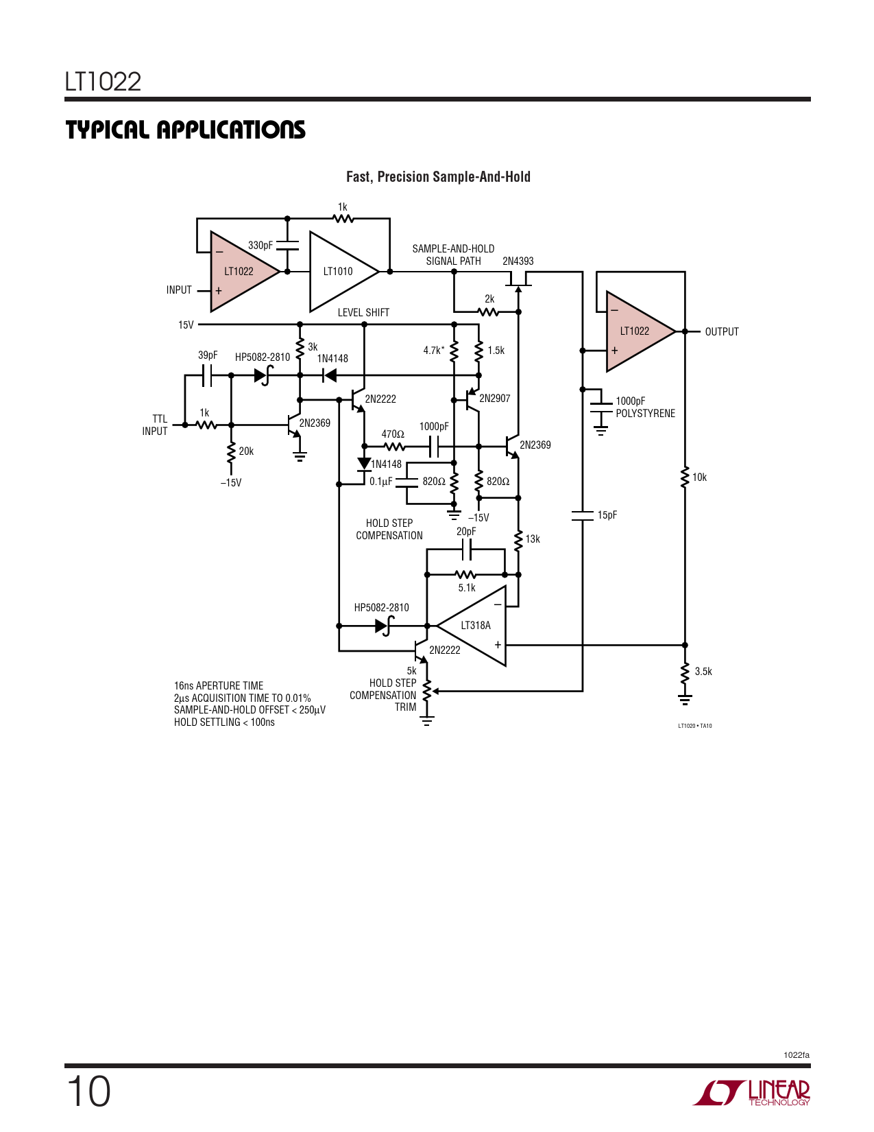 1k 330pF SAMPLE-AND-HOLD – SIGNAL PATH 2N4393 LT1022 LT1010 INPUT + 2k LEVEL SHIFT – 15V LT1022 OUTPUT 3k 4.7k* 1.5k + 39pF HP5082-2810 1N4148 2N2222 2N2907 1000pF 1k POLYSTYRENE TTL 2N2369 INPUT 1000pF 470Ω 2N2369 20k 1N4148 10k –15V 0.1µF 820Ω 820Ω 15pF –15V HOLD STEP COMPENSATION 20pF 13k 5.1k HP5082-2810 – LT318A + 2N2222 5k 3.5k HOLD STEP 16ns APERTURE TIME COMPENSATION 2µs ACQUISITION TIME TO 0.01% TRIM SAMPLE-AND-HOLD OFFSET < 250µV HOLD SETTLING < 100ns LT1020 • TA10 1022fa 10